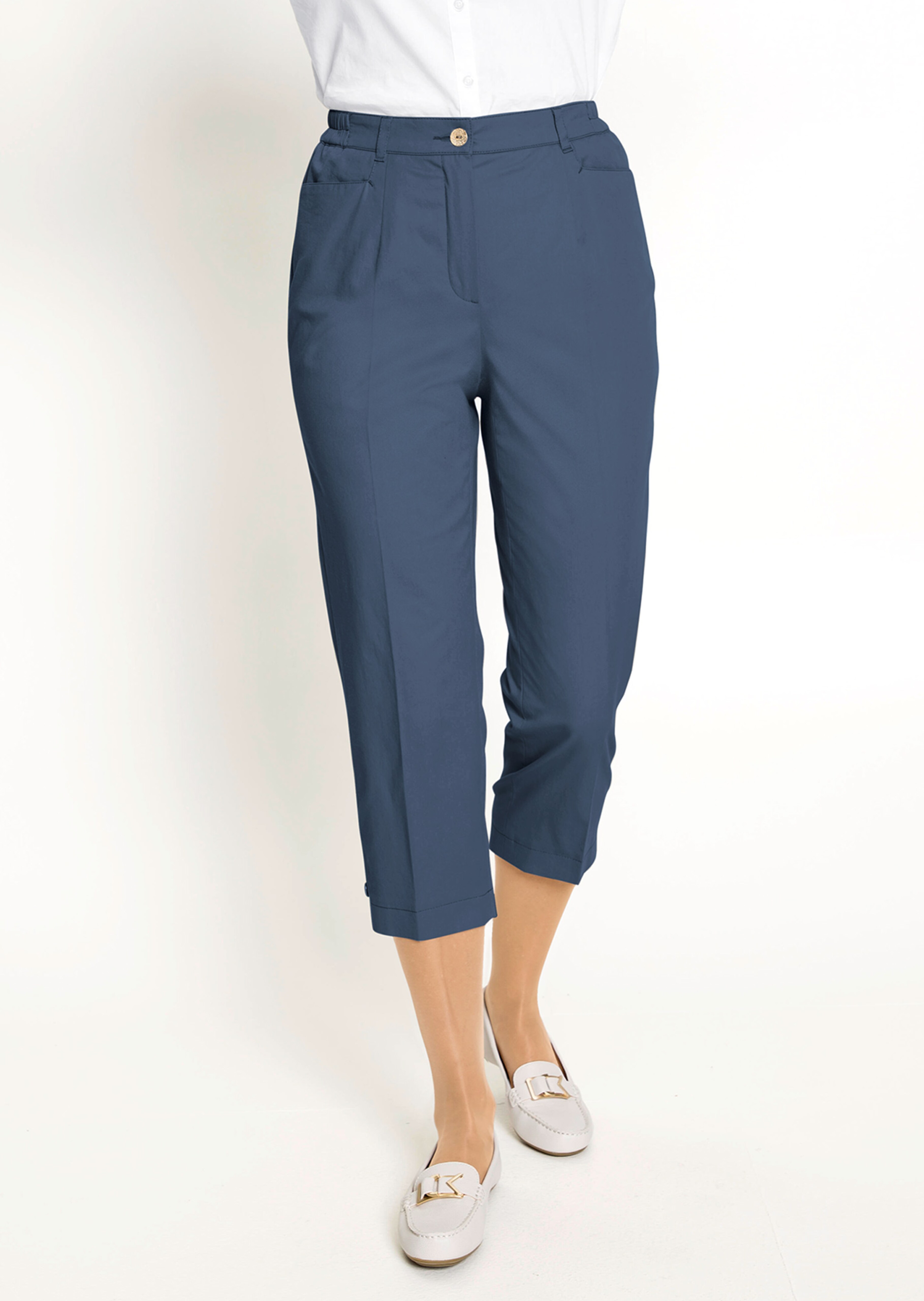 3/4-Baumwollhose im Klassik-Schnitt aus Pima Baumwolle – ein edles, seidenähnliches Gewebe mit sehr feinen, langen Fasern. Dieses macht das Modell sehr weich, langlebig und strapazierfähig und begeistert mit bestem Komfort, gutem Feuchtigkeitstransport und geringerer Knitterneigung. Mit streckender Bügelfalte, dekorativen Goldknöpfen, bequemem Teildehnbund mit Gürtelschlaufen sowie Stecktaschen. Saumweite ca. 42 cm. Gerade Beinweite.