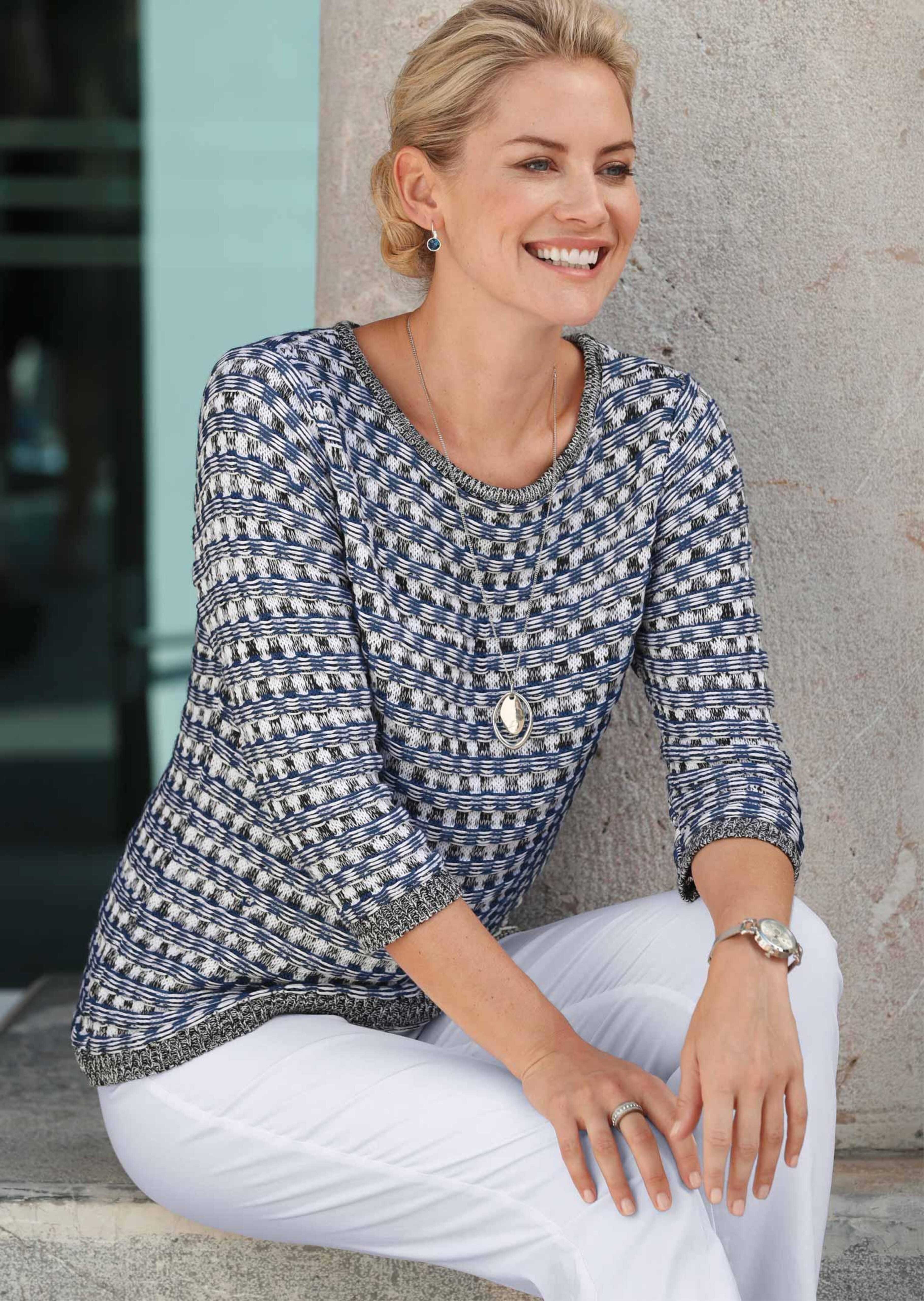 Pullover mit sehr aufwendiger 3D-Strickstruktur in dezenter Ringeloptik – hier schaut man gerne ein zweites Mal hin. Das Multicolor-Garn unterstreicht den edlen Charakter. Herrlich weiche, ultraleichte Kuschelqualität. Eine Blende in Kontrastfarbe setzt an U-Boot-Ausschnitt, 3/4-Ärmeln und Saum feine Akzente. Länge ca. 67 cm in Gr. 46, ca. 63 cm in Gr. 23.