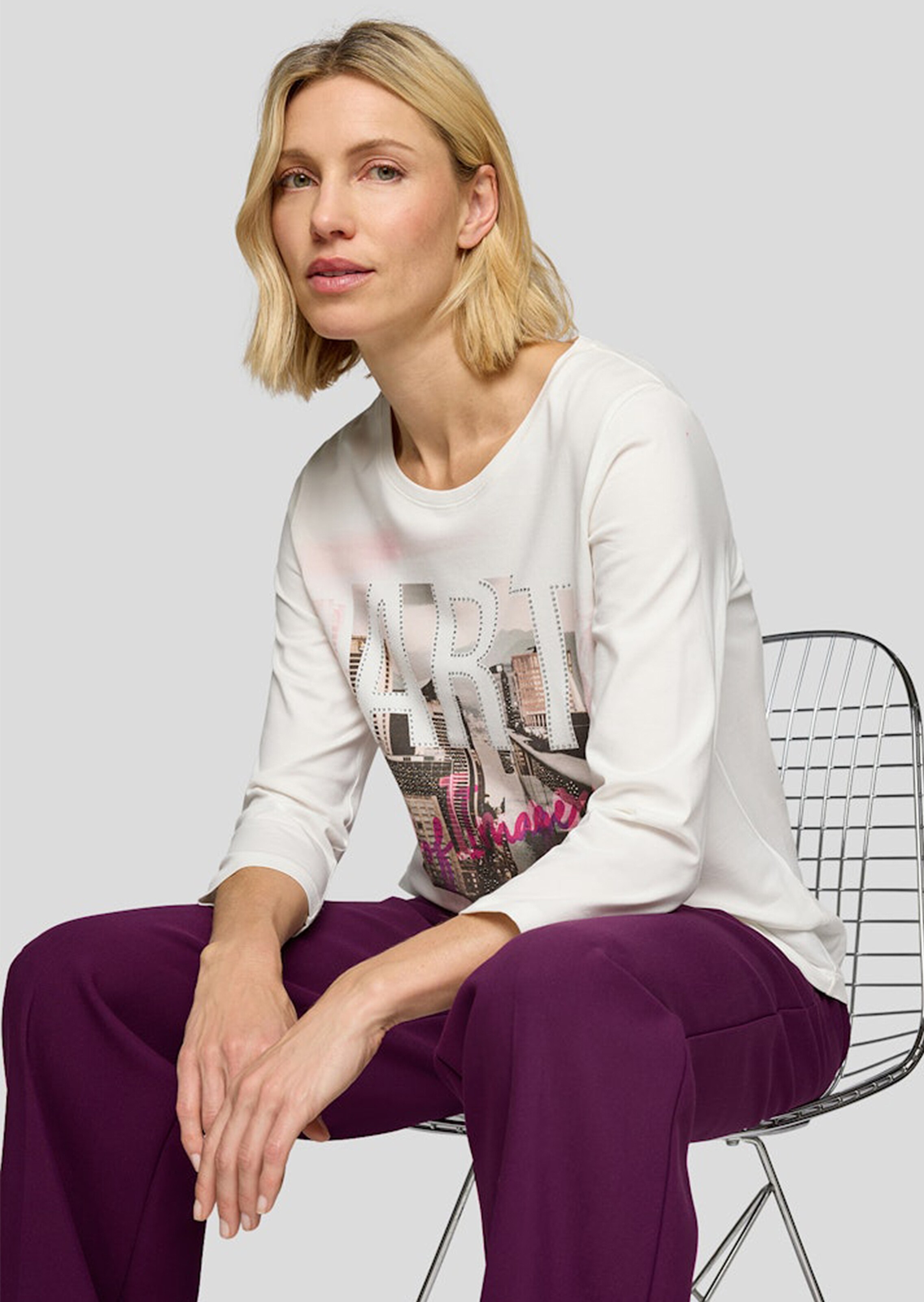 Shirt mit Frontmotiv von RABE in trageangenehmer Baumwoll-Ware. Das moderne Fotomotiv wird von einem mit Glitzersteinen verzierten Schriftzug eingefasst und bringt das schlichte Modell damit zum Strahlen. Mit Rundhalsausschnitt und 3/4-langen Ärmeln ist das Modell ein vielseitiger Kombi-Partner. Länge ca. 66 cm in Gr. 46.