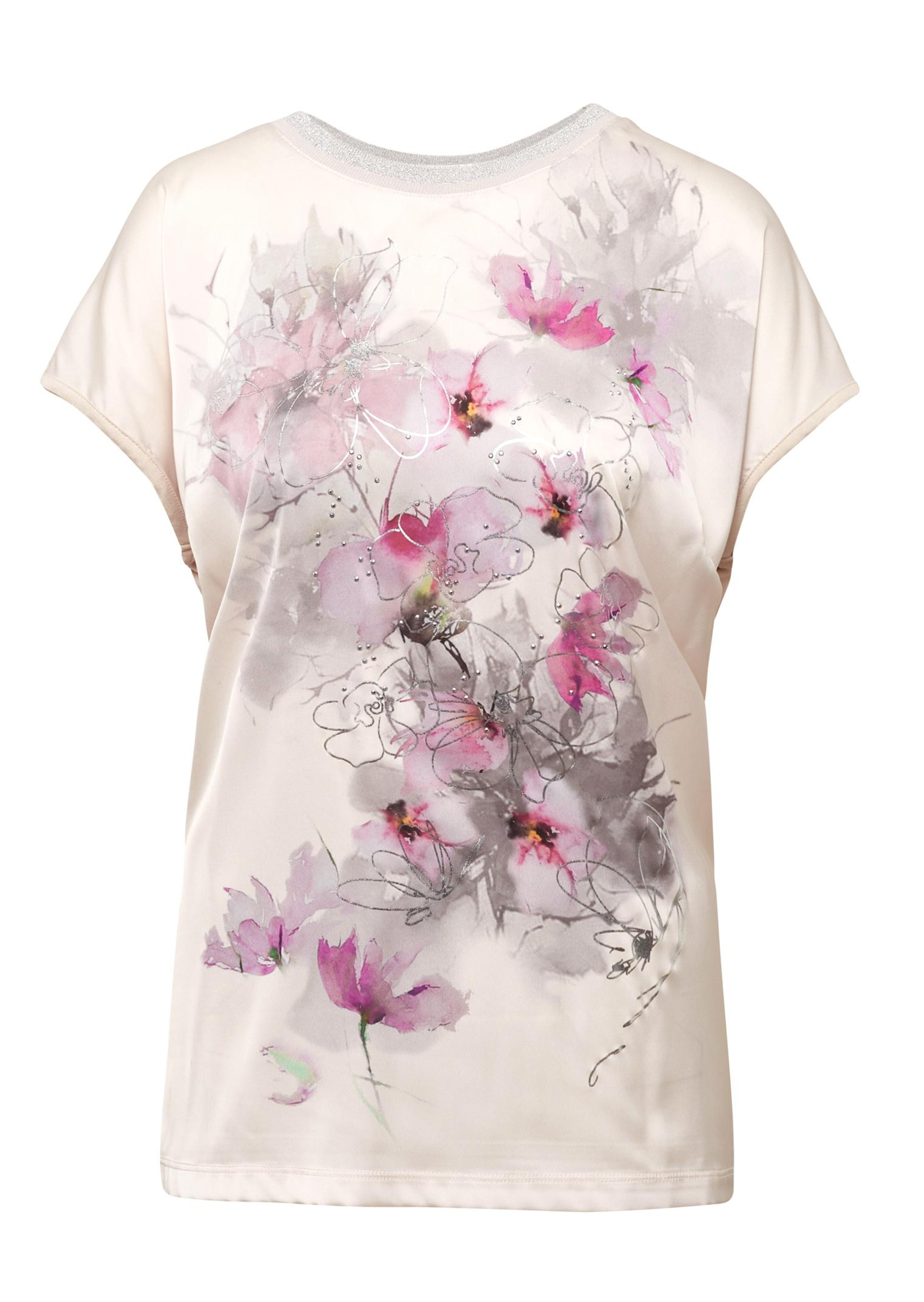 Blusenshirt mit einem Rückteil aus Jersey und einem Vorderteil aus einer satinierten stretchbequemen Ware, die den hübschem Frontdruck besonders gut zur Geltung bringt. Zusätzlich wird das Blumendessin von funkelnden Glitzersteinen betont – ein toller Effekt! Überschnittene Schulter und Brustabnäher für guten Sitz. Länge ca. 66 cm in Gr. 46, ca. 62 cm in Gr. 23.