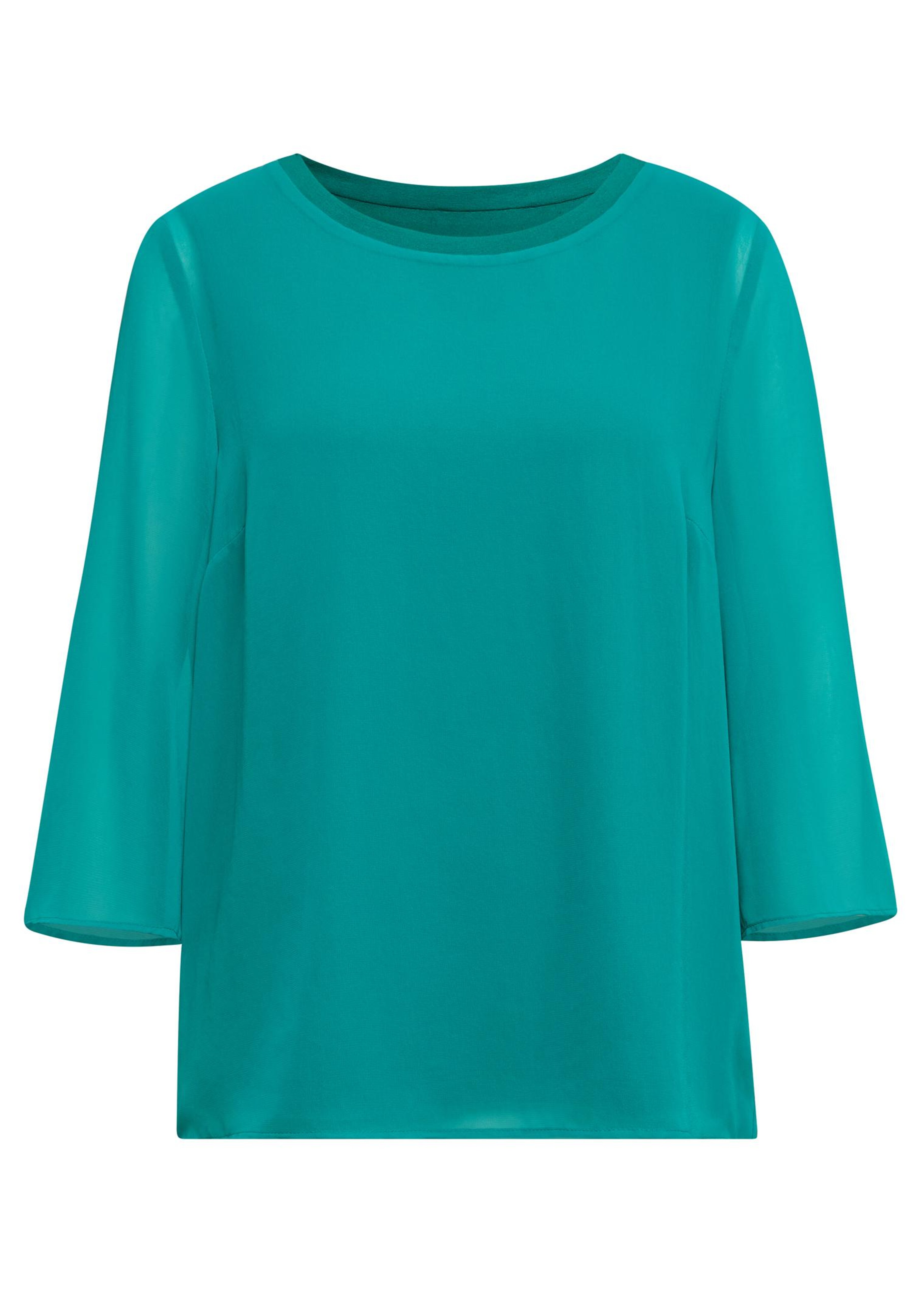 Gedoppeltes Blusenshirt in raffinierter 2-in-1-Optik. Ab sofort entfällt die Suche nach einem passenden Teil zum Unterziehen, denn das Jerseytop ist bereits fest eingenäht. So sitzt es perfekt und macht die transparente Chiffonware nahezu blickdicht. Begeistern wird Sie auch der schön fallende, legere und modisch weite Schnitt mit Rundhals und 3/4-langen Ärmeln. Das Shirt ist herrlich pflegeleicht und gut kombinierbar – ein absoluter GOLDNER-Liebling eben! Länge ca. 66 cm in Gr. 46, ca. 62 cm in Gr. 23.