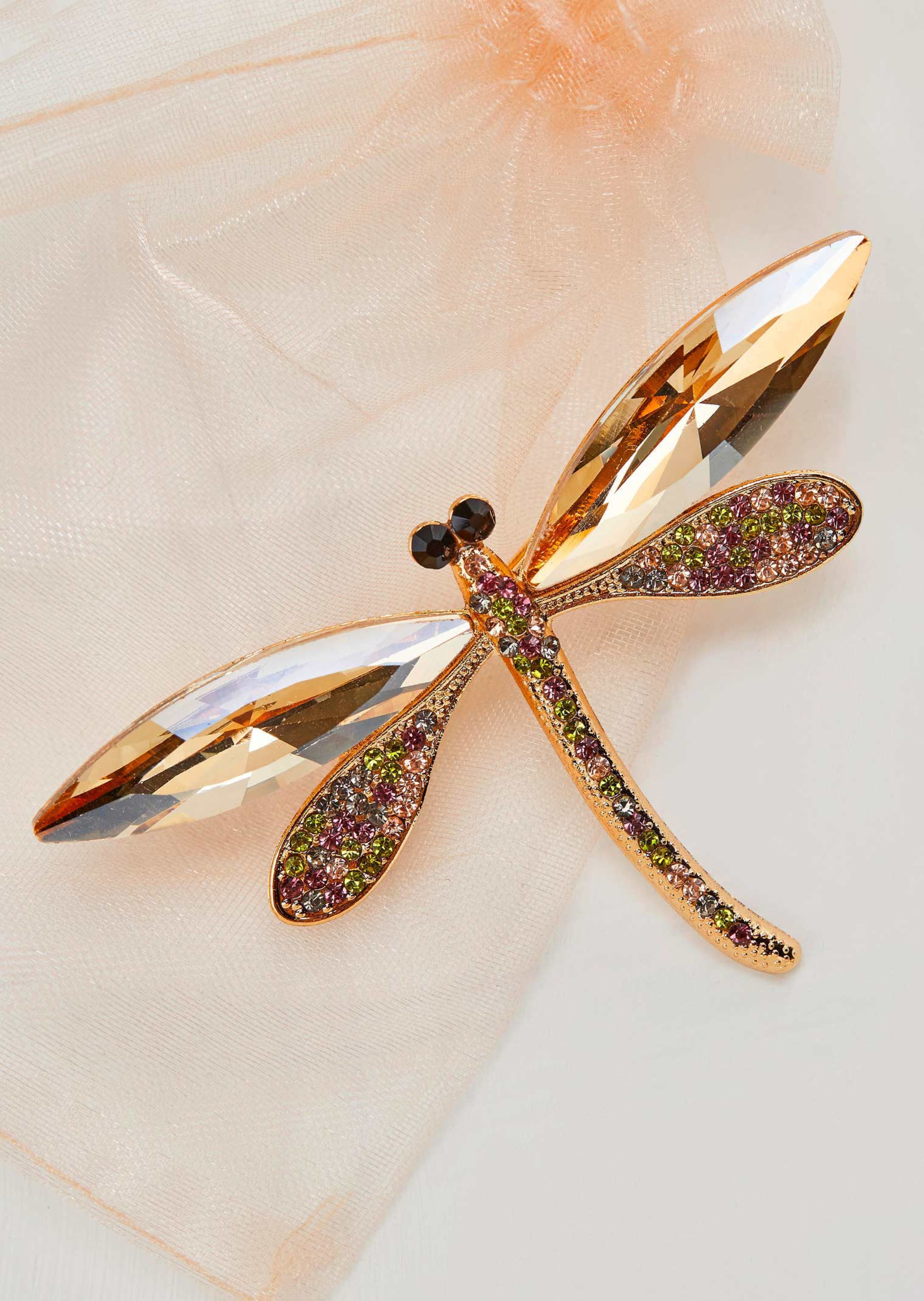 Brosche in zauberhafter Libellen-Form. Verleiht jedem Outfit das gewisse Etwas. Sie ist mit zahlreichen bunten Glassteinen verziert, die in den schönsten Farben funkeln. Die beiden großen Flügel sind mit je einem großen Glasstein besetzt, was sommerliche Leichtigkeit versprüht. Mit praktischer, goldfarbener Schließnadel. Lieferung im Organzabeutel.
