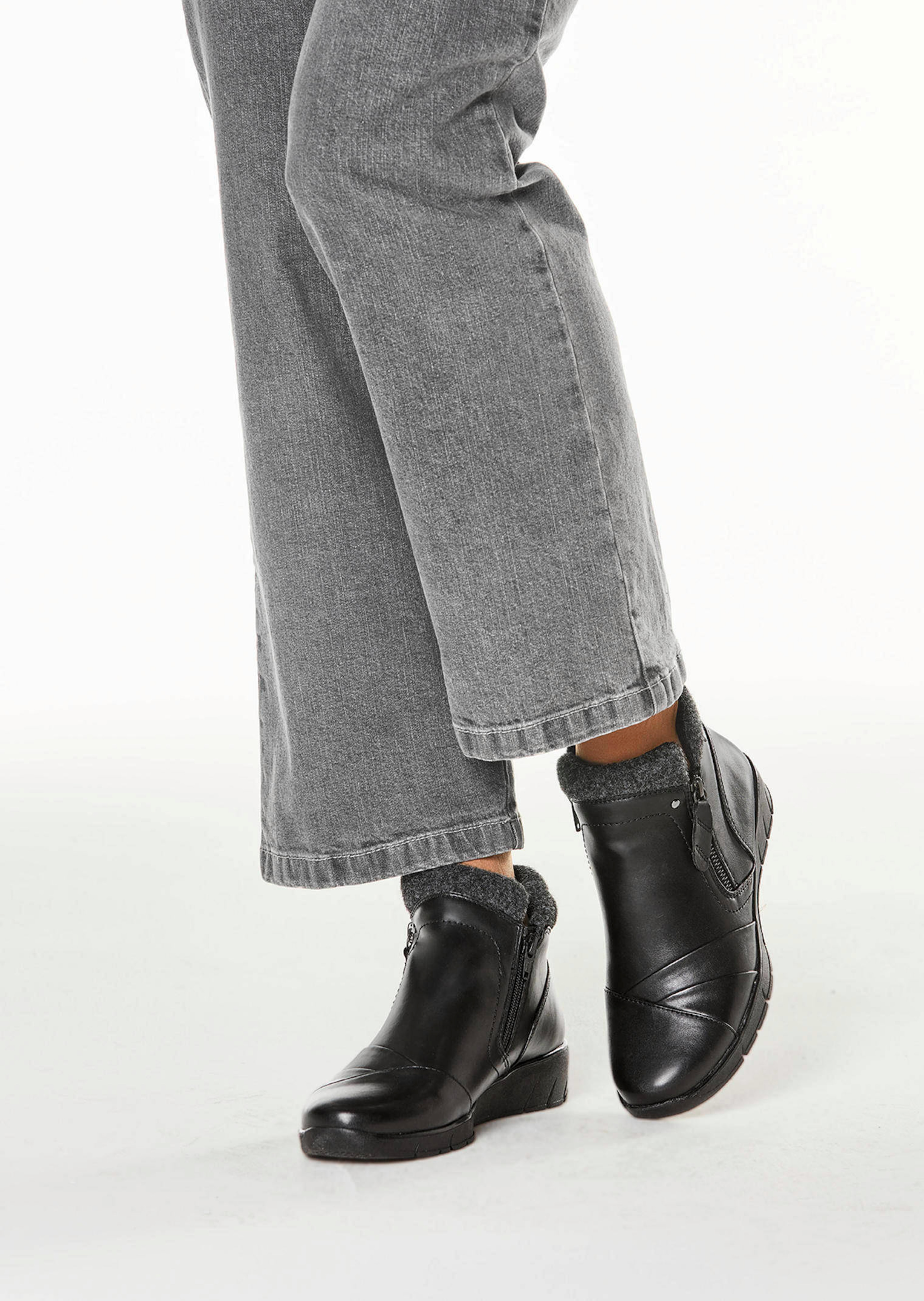 Halbstiefel von JANA SOFTLINE mit SoftFlex-Laufsohle für komfortables Gehvergnügen. Der Schaft ist in Filzoptik gestaltet, auch die dekorativen Ziernähte sorgen für stilvolle Akzente. Der leicht gefütterte Stiefel ist besonders pflegeleicht, 2 kleine Reißverschlüsse erleichtern das An- und Ausziehen. Mit Wechselfußbett.
