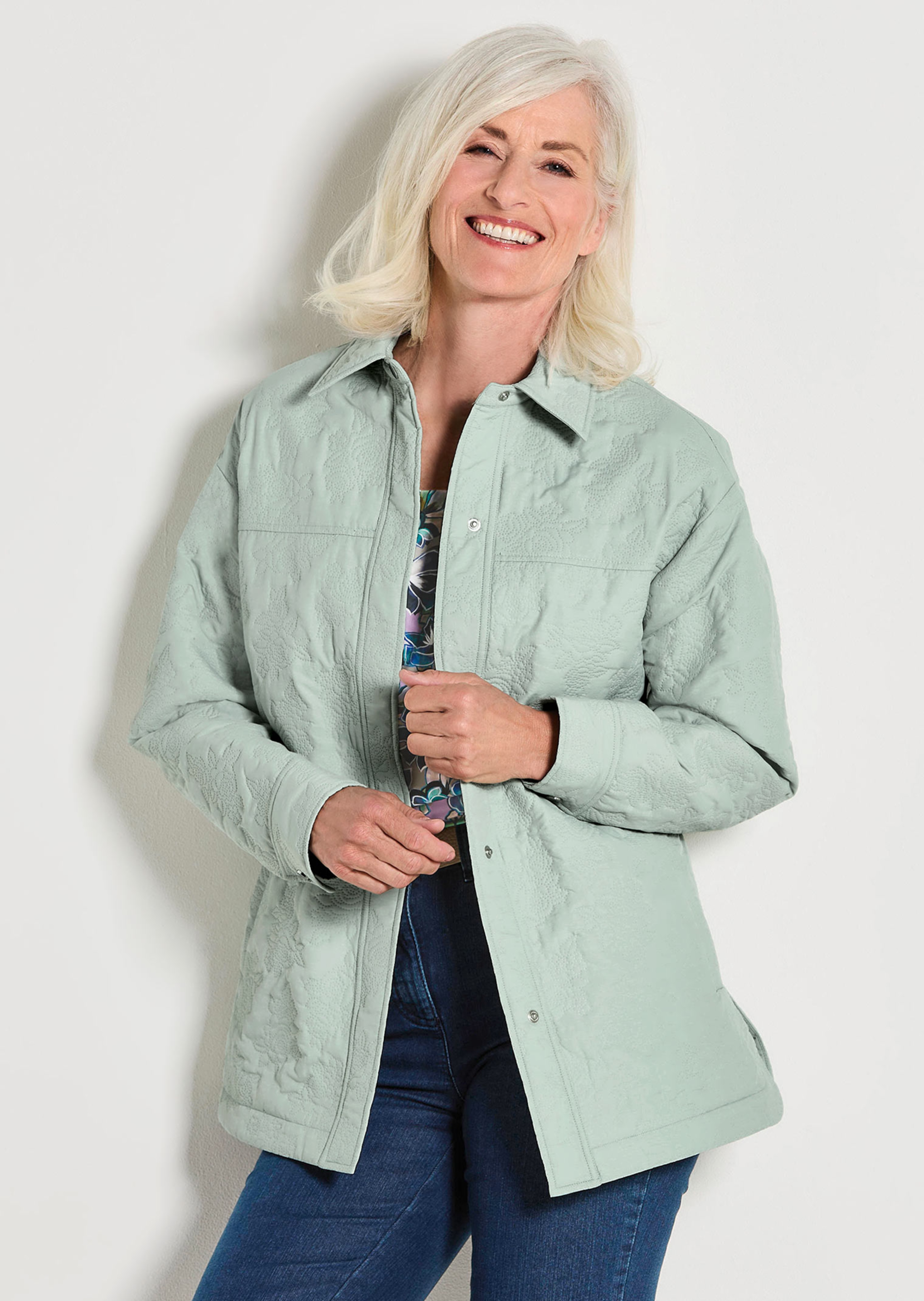 Hemdjacke in leichter Qualität, die dank einer floralen Prägung zum Blickfang wird. Mit charakteristischem Hemdkragen, verdeckter Knopfleiste mit Druckknöpfen und Seitennahtschlitzen. Eine Passe im Vorder- und Rückteil sorgt für die perfekte Passform. Ärmel mit Manschette und Druckknopf gearbeitet. Zwei Eingriffstaschen runden das Modell gekonnt ab. Länge ca. 79 cm in Gr. 46, ca. 75 cm in Gr. 23.