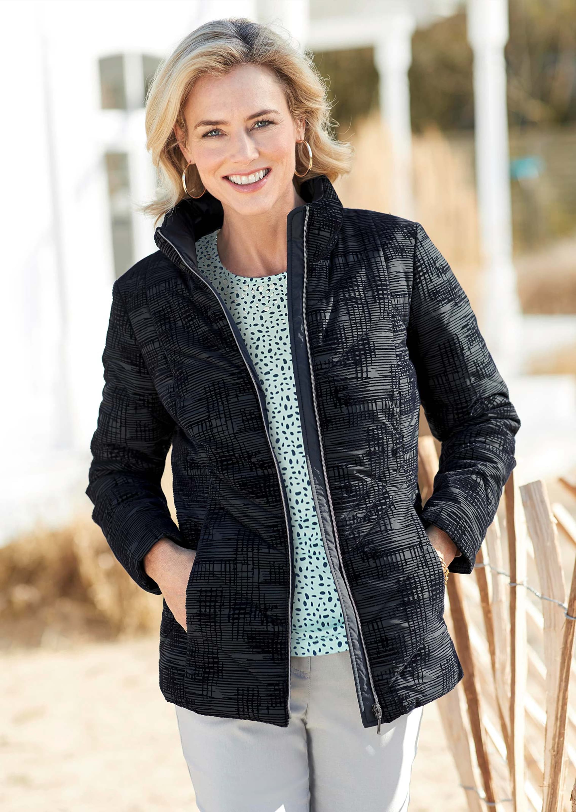 Steppjacke mit sehenswertem Flockprint für eine ganz besondere Haptik. Weiteres Plus: der Print versteht es, geschickt zu kaschieren. Mit Stehkragen, der mit dem Reißverschluss zu schließen ist. Die feinen Nahttaschen sind innen gefüttert für besonders angenehme Wärme an den Händen. Länge ca. 73 cm in Gr. 46, ca. 69 cm in Gr. 23.