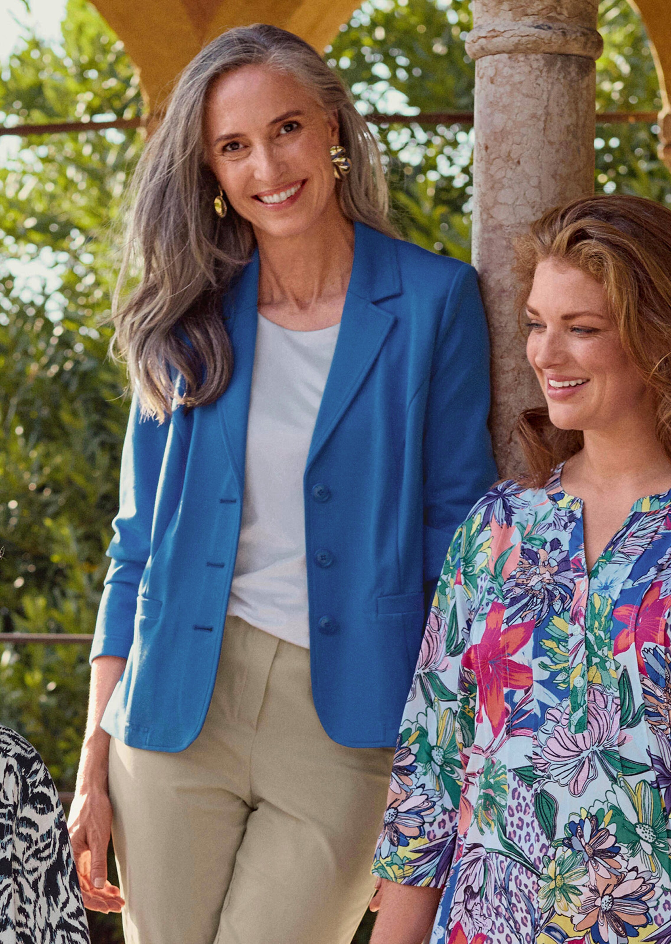 Blazer in leicht verkürzter Länge – ideal für weite Hosen oder zu Röcken und Kleidern! Der mit Beleg gearbeitete Reverskragen ist schmal abgesteppt, die figurformenden Wiener Nähte zaubern eine feminine Silhouette. Der pflegeleichte Jersey mit Viskose sorgt für hohen Tragekomfort. Leistentaschen und Knöpfe als Verschluss runden das ungefütterte Modell harmonisch ab. Länge ca. 62 cm in Gr. 46, ca. 59 cm in Gr. 23.