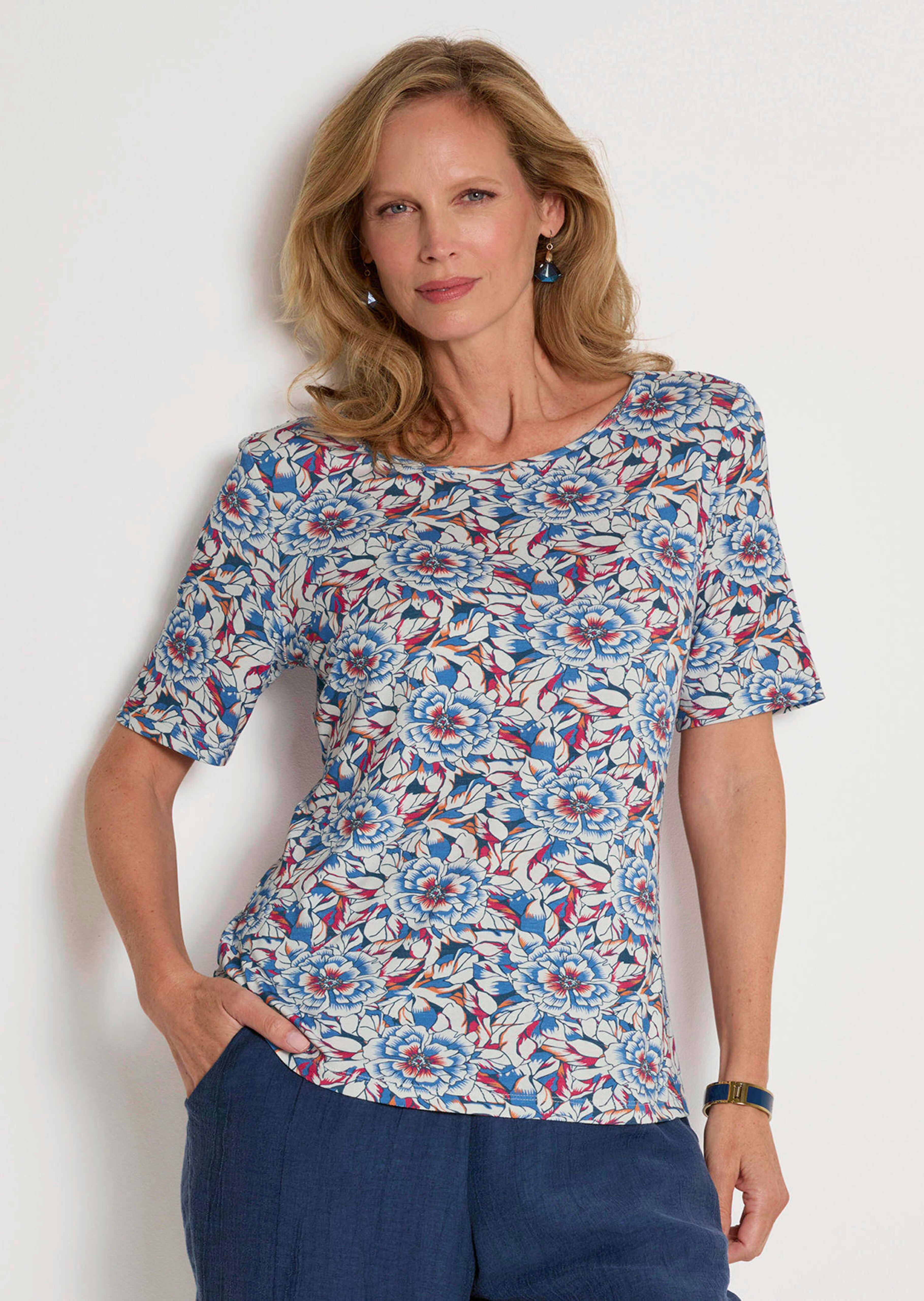 Shirt in farbenfrohem Alloverdruck. Die weiche Jersey-Qualität aus Viskose ist hautsympathisch und trageangenehm – ein wahrer Hautschmeichler. Der U-Boot-Ausschnitt ist schmal eingefasst, halblange Ärmel und die figurumspielende, hüftlange Passform sorgen für Komfort. Länge ca. 64 cm in Gr. 46, ca. 60 cm in Gr. 23.