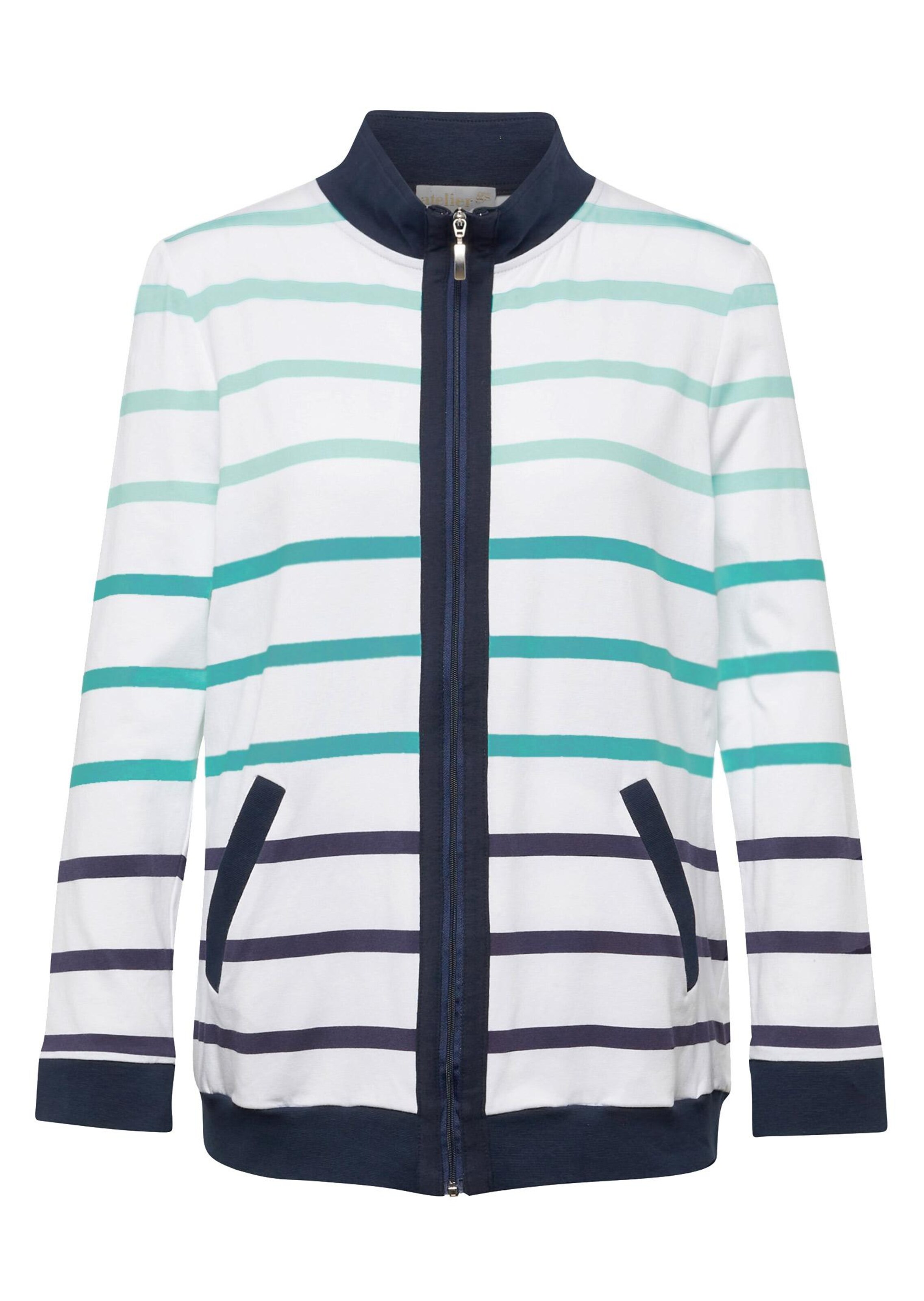 Freizeitjacke mit sportivem Streifendessin auf leichter Baumwoll-Stretch-Qualität – formstabil und trageangenehm. Mit Auslegekragen, der auch als Stehkragen getragen werden kann. Unifarbener Streifen an Reißverschluss und farblich abgesetzte Eingrifftaschen. Unifarbene Bündchen an Saum und Ärmelabschluss runden das Gesamtbild ab. Länge ca. 70 cm in Gr. 46, ca. 66 cm in Gr. 23.
