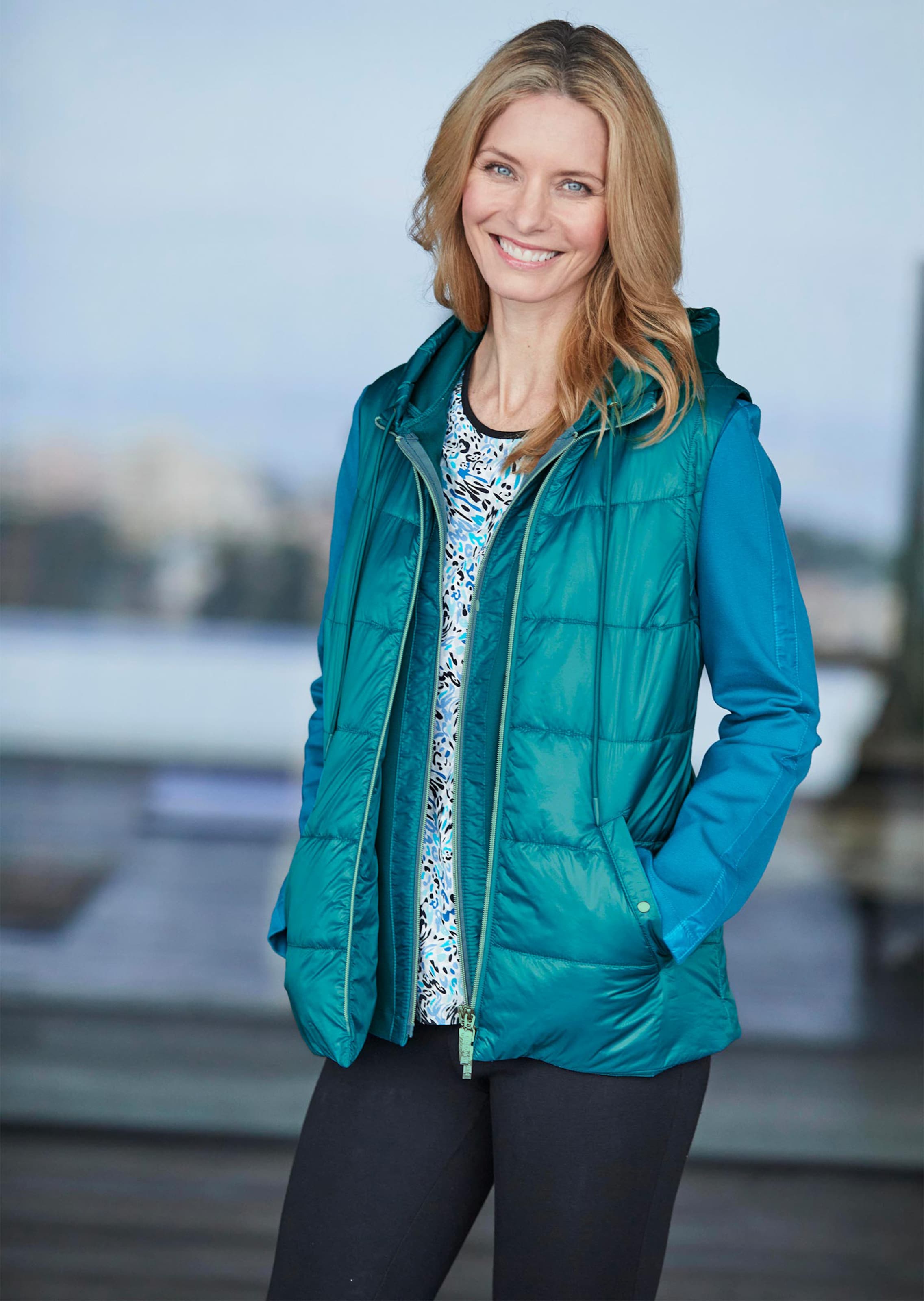 Steppweste mit dezentem Glanz, die für alle Freizeitaktivitäten die richtige Begleitung ist. Leicht wattiert und wärmend zeigt sie sich detailreich mit 2-Wege-Reißverschluss, seitlichen Eingrifftaschen mit Zierniete, Stehkragen sowie quer verlaufenden Steppnähten. Länge ca. 69 cm in Gr. 46, ca. 65 cm in Gr. 23.