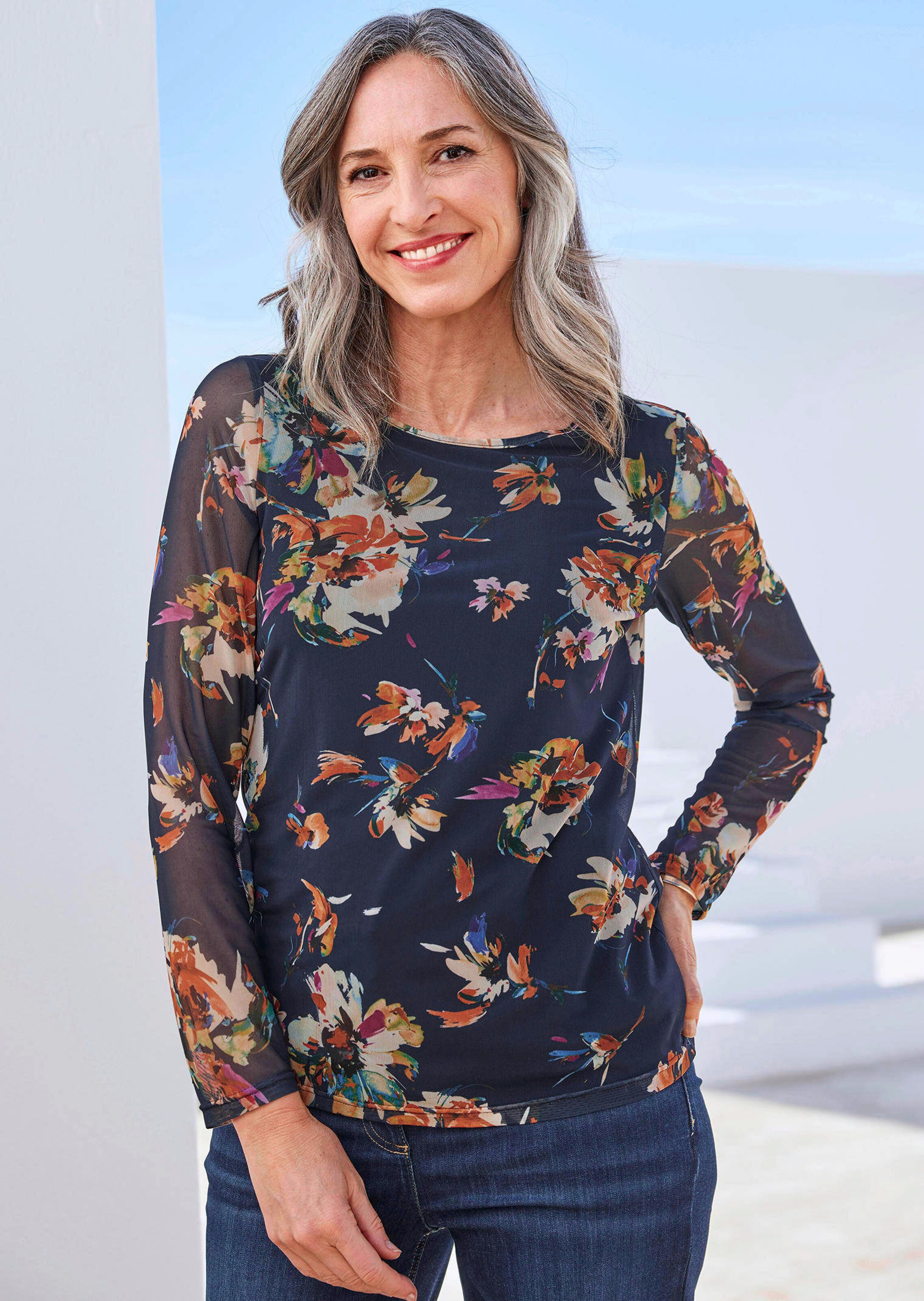 Mesh-Shirt mit leuchtendem Blumenmuster, das immer gute Laune macht. Aus weich-fließender Ware für höchsten Tragekomfort. Am Vorder- und Rückteil blickdicht mit Jersey unterfüttert, die langen Ärmel sind leicht transparent. Der U-Boot-Ausschnitt unterstreicht die feminine Optik. Dank der pflegeleichten und stretchbequemen Eigenschaften ist das Shirt besonders angenehm zu tragen. Jedes Teil ein Unikat! Länge ca. 66 cm in Gr. 46, ca. 62 cm in Gr. 23.