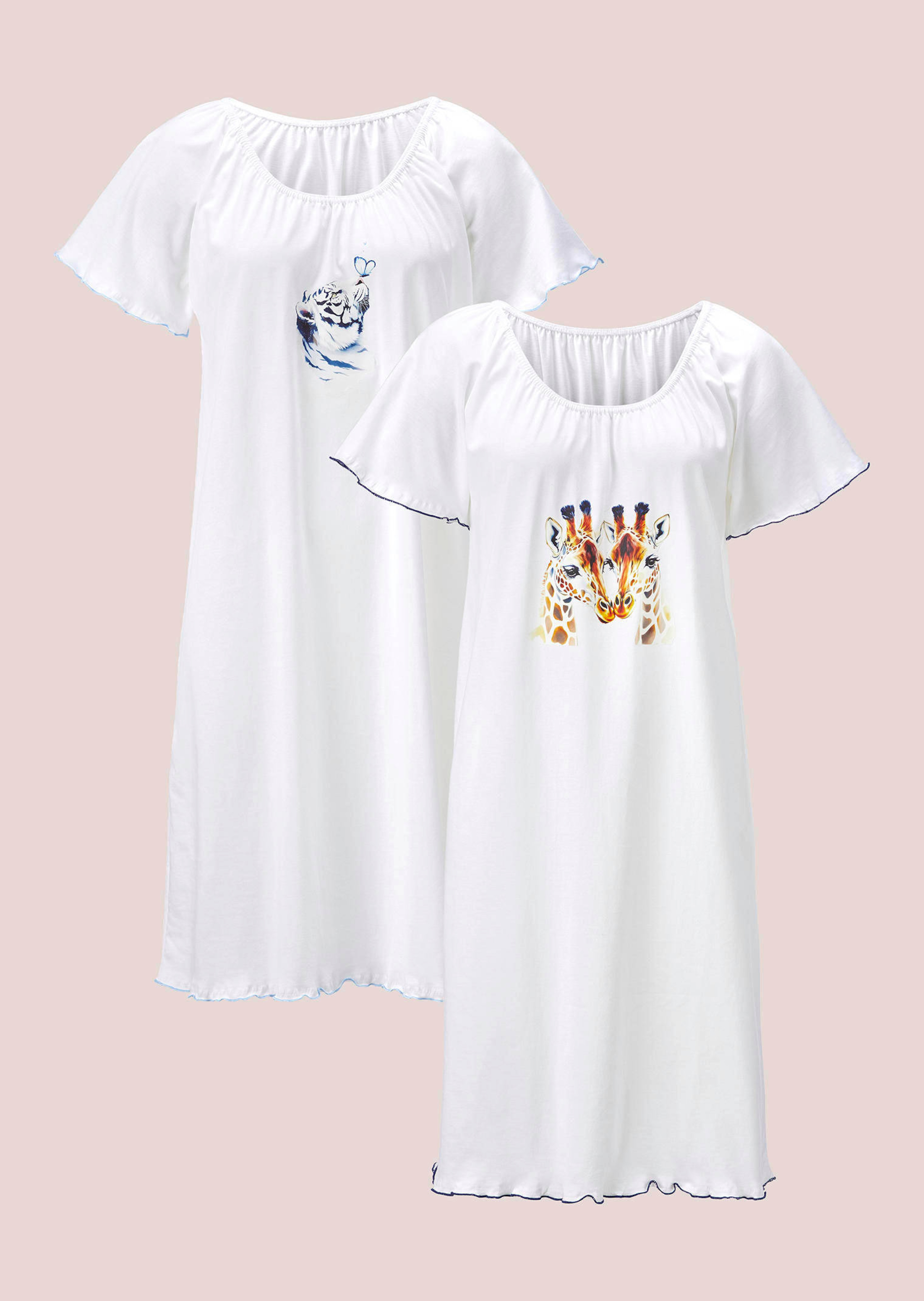 Nachthemden 2er-Pack aus reiner Baumwoll-Qualität, die soft und leicht auf der Haut liegt. Das Modell besticht durch eine legere Passform mit leicht geraffter Optik am Rundhalsausschnitt, einfach zum Hineinschlüpfen und angenehm zum Tragen. Kontrastfarbene Wellenkanten an den Raglenärmeln und am unteren Saum bringen Farbe ins Spiel. Mit je einem fantasievollen Motiv-Druck in exotischem Look.