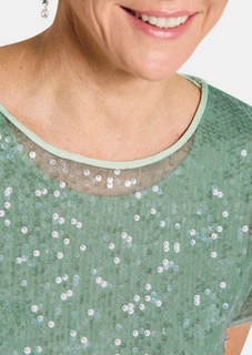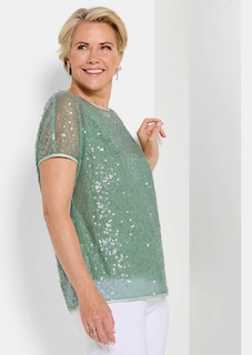 Schlupfbluse mit schimmernden Pailletten für einen funkelnden Auftritt. Der legere Schnitt mit U-Boot-Ausschnitt und überschnittenen Schultern schmeichelt der Silhouette, Satinbänder als Einfassung setzen edle Akzente. Ein farblich passendes Top aus weichem Viskose-Satin sorgt dafür, dass nichts durchscheint, und kann auch separat getragen werden. Länge ca. 69 cm in Gr. 46, ca. 65 cm in Gr. 23.