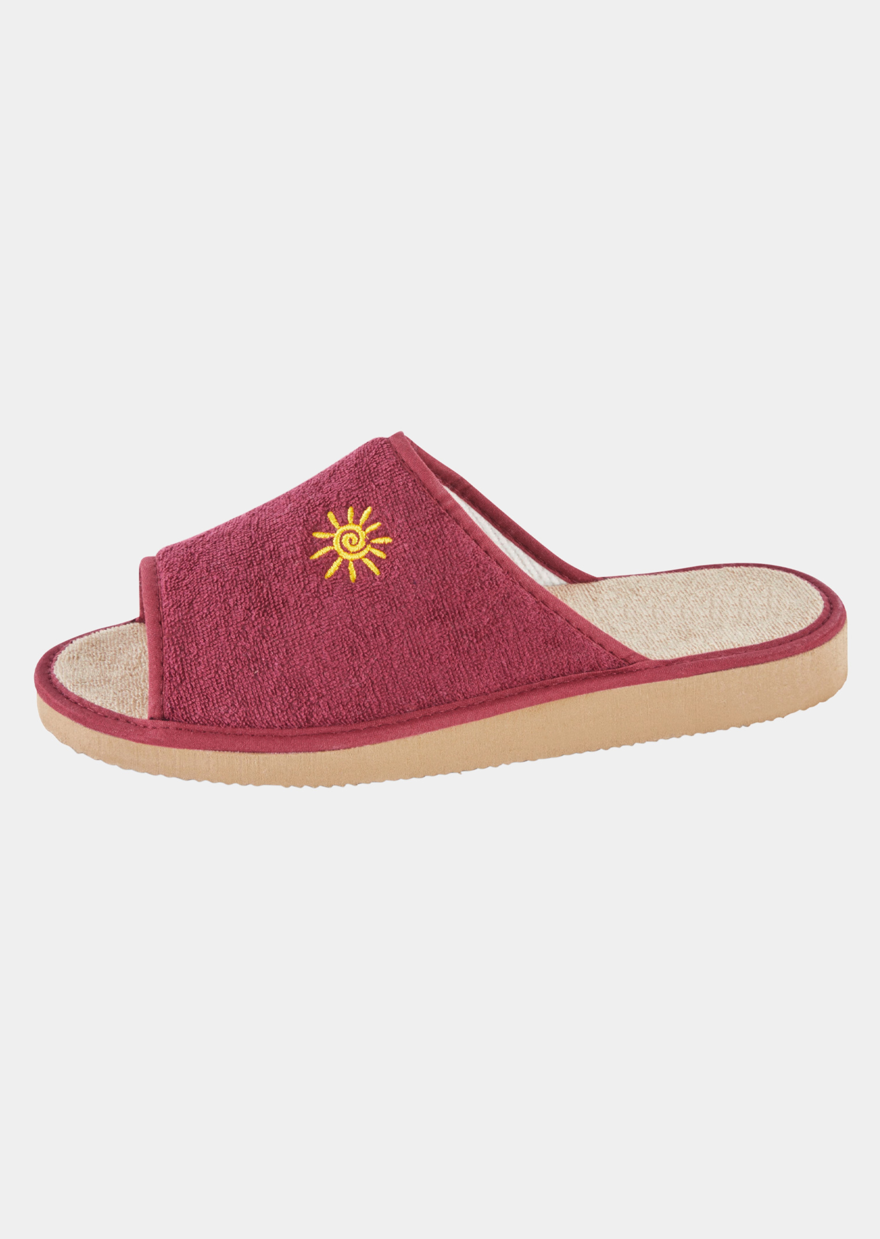 Pantoletten in G-Weite aus weicher Baumwolle innen und außen. Eine hübsche Sonnenstickerei ziert den Hausschuh und setzt sommerliche Akzente. Für angenehme Belüftung sorgt die offene Zehenpartie, sicheren Halt verspricht die Laufsohle aus Kautschuk.