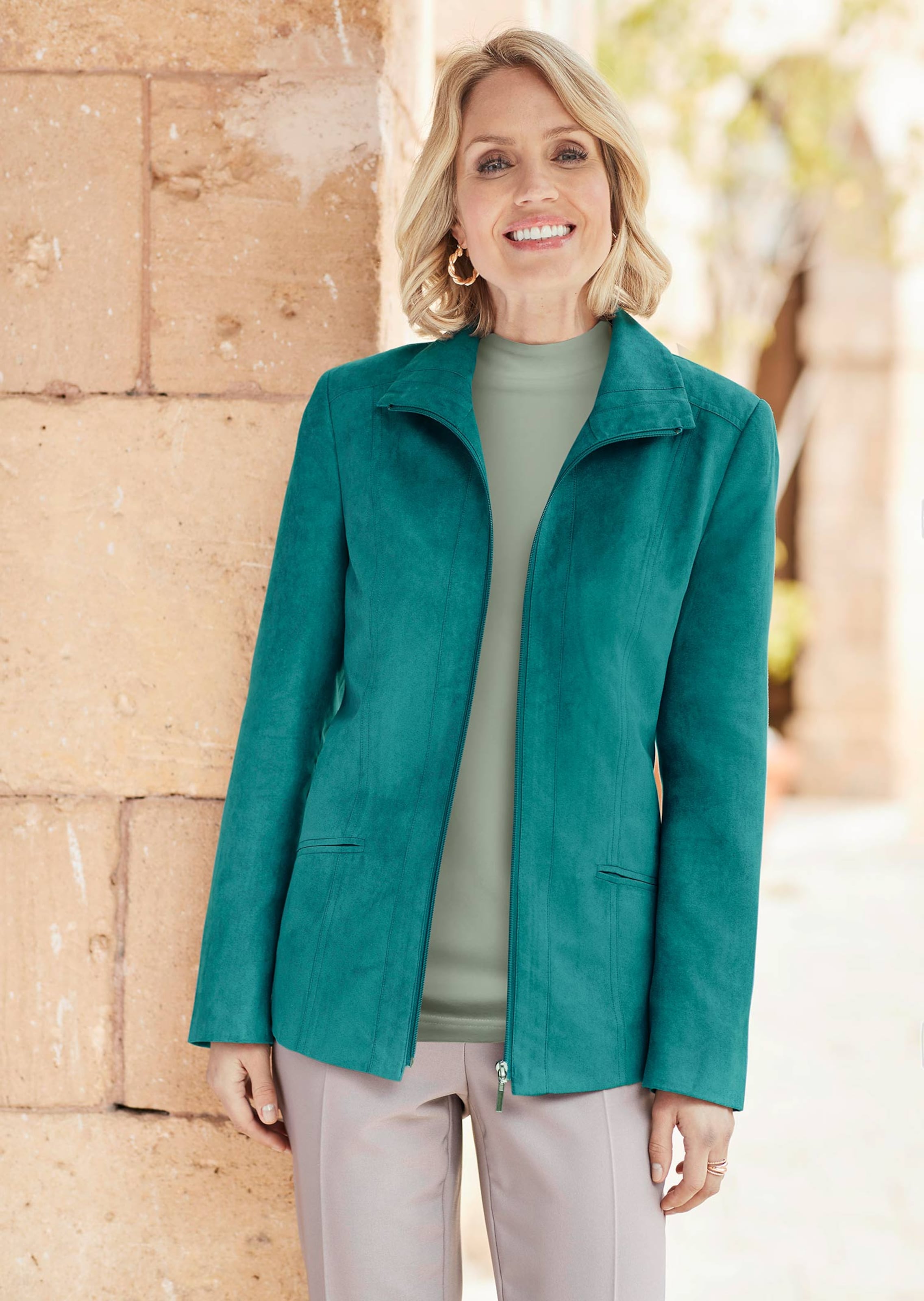 Jacke in Velourslederoptik: Fühlen Sie dieses streichelweiche Material, das den Griff von echtem Velours hat, aber viel pflegeleichter ist! Die Teilungsnähte vorne und hinten geben Form und schenken so perfekte Passform. Mit leichtem Futter gearbeitet sowie sportlichem Stehkragen, der auch gelegt getragen werden kann und paspelierten, schrägen Eingrifftaschen. Eine Innentasche mit Knopf und lange, geschlitze Ärmel. Das Modell lässt sich mit Reißverschluss schließen. Länge ca. 67 cm in Gr. 46, ca. 63 cm in Gr. 23.