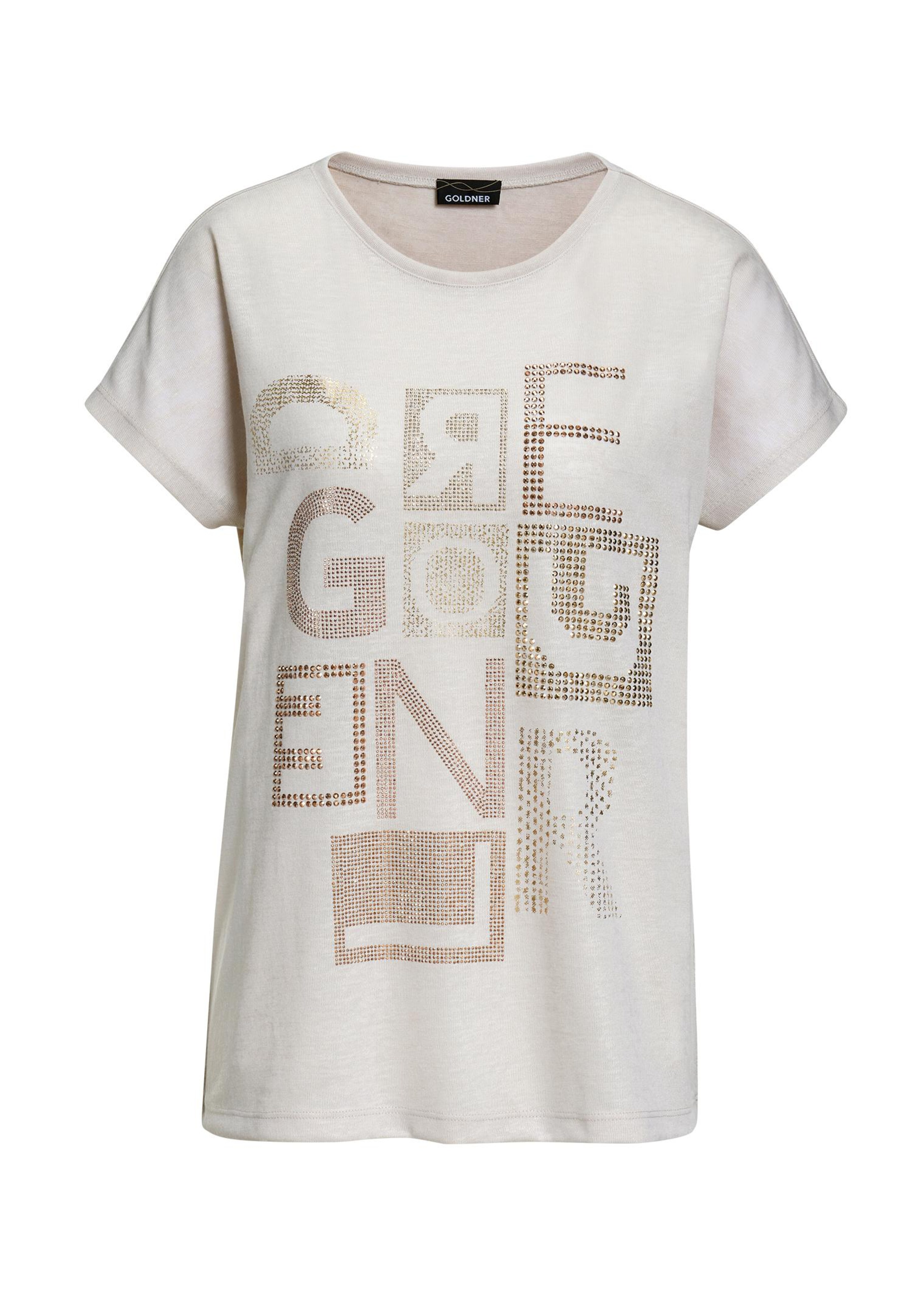 Shirt mit Flammgarn und effektvollem Foil-Druck im Vorderteil – ein echter Blickfang! Große, schimmernde Buchstaben setzen dabei spannende Akzente. Detailreich gearbeitet mit Rundhalsausschnitt und kurzen, überschnittenen Ärmeln. Die lässige Passform lässt sich toll zu schmal geschnittenen Hosen kombinieren. Länge ca. 66 cm in Gr. 46, ca. 62 cm in Gr. 23.