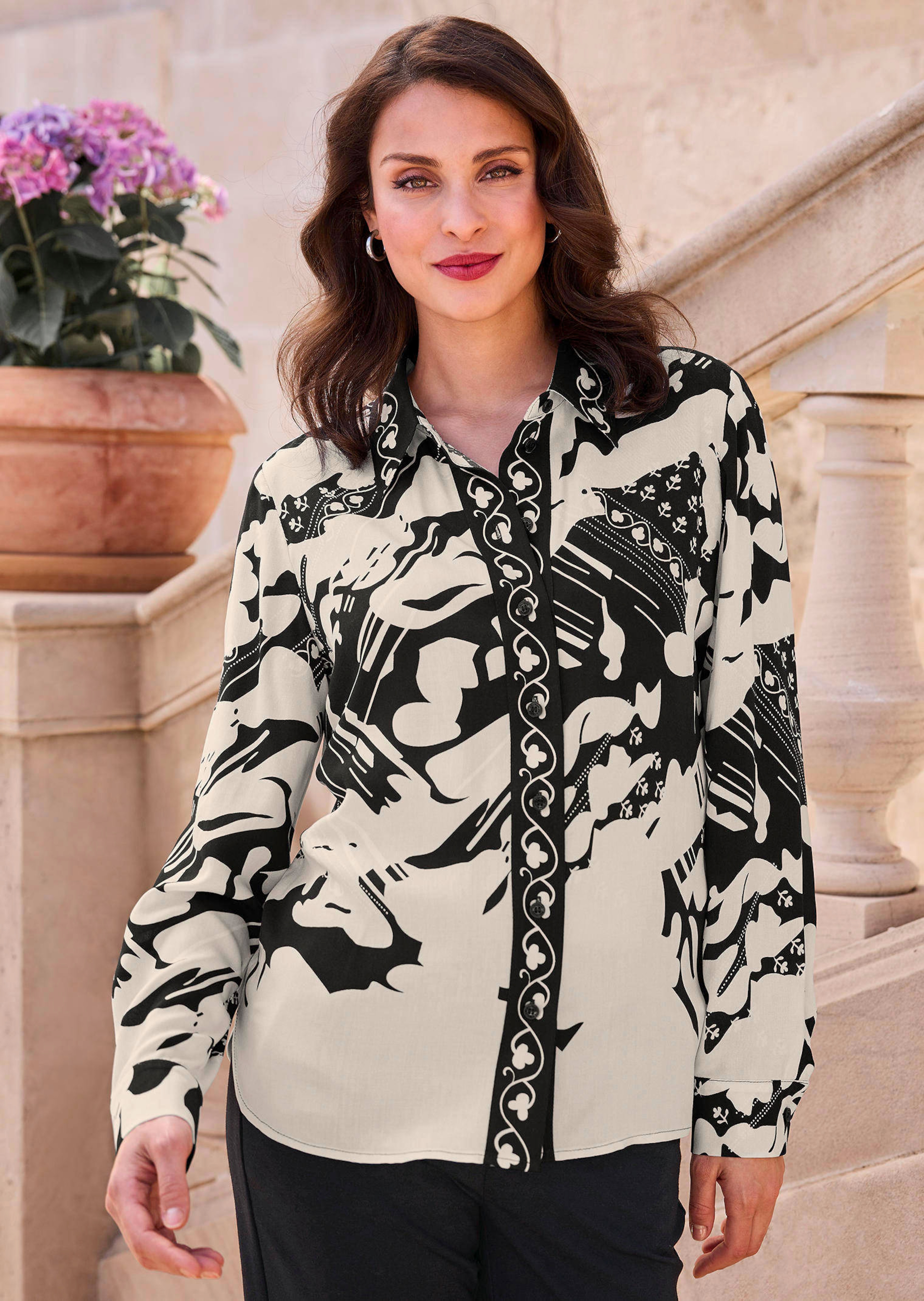 Die elegante Longbluse von ALBA MODA ist ein aufregender Blickfang für vielseitige Stylings. Mit ihrem platzierten Bicolor-Print auf glänzendem Satin ist sie der Mittelpunkt eines jeden Outfits. Die reine Viskose begeistert mit weich fließendem Fall und macht die schicke Bluse fantastisch im Tragekomfort. Die durchgehende Knopfleiste wird durch den attraktiven Bordüren-Print besonders betont, was dem femininen Modell noch mehr Stil verleiht. Länge in Gr. 38 ca. 64 cm. Styling-Tipp: Das Schwarz-Weiß-Dessin der Bluse kommt besonders gut zur Geltung, wenn Sie sie mit dunklen Jeans oder einer schwarzen Hose kombinieren.