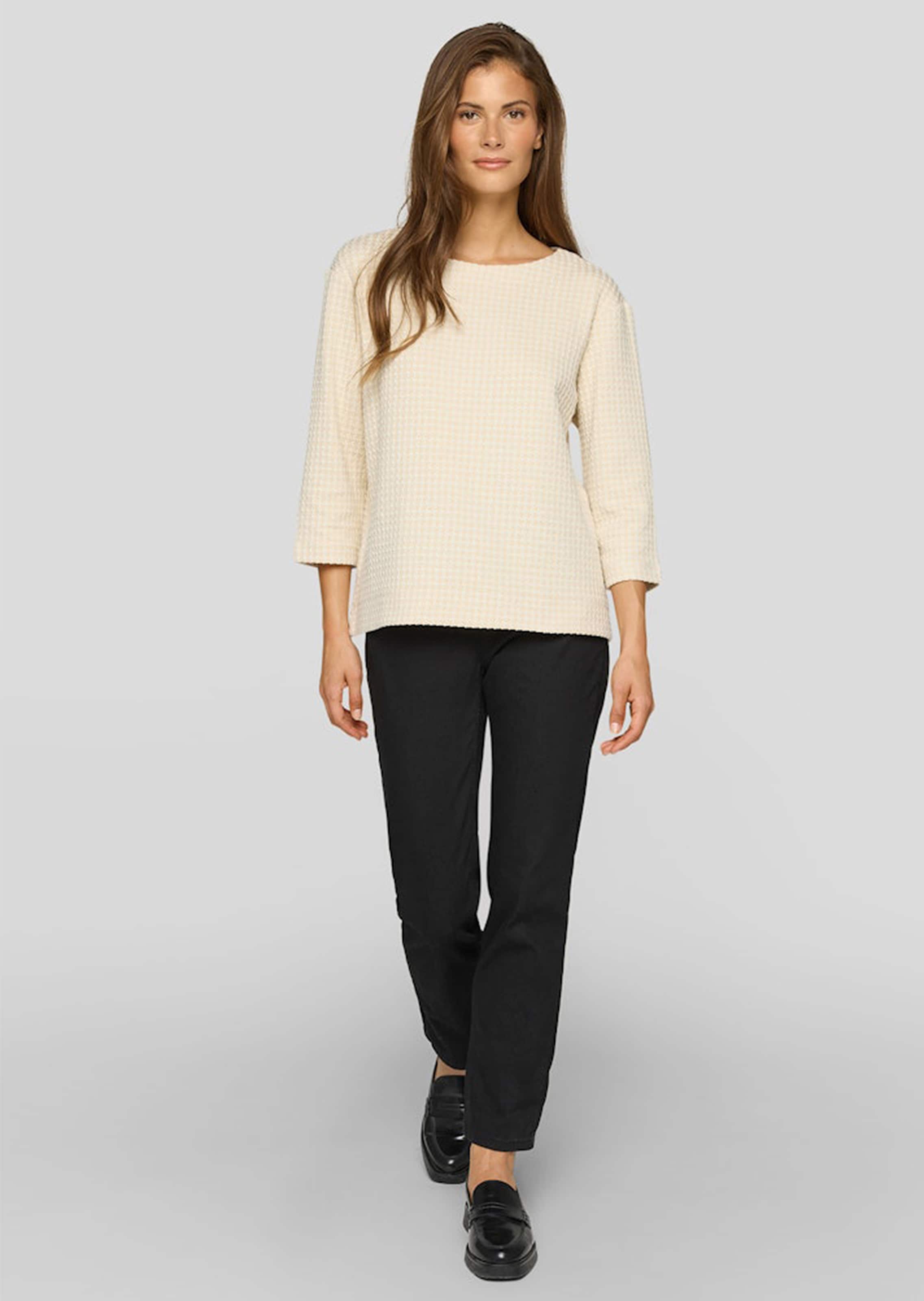 Strukturshirt von RABE mit edlem Hahnentritt-Jacquardmuster, das leicht strukturiert einen leichten 3D-Effekt erzeugt. Das Modell aus einer dichten, formstabilen Baumwollmischung ist gerade geschnitten, der Rundhalsausschnitt breit abgesteppt. 3/4-lange Ärmel sorgen für einen eleganten Look. Länge ca. 66 cm in Gr. 46.