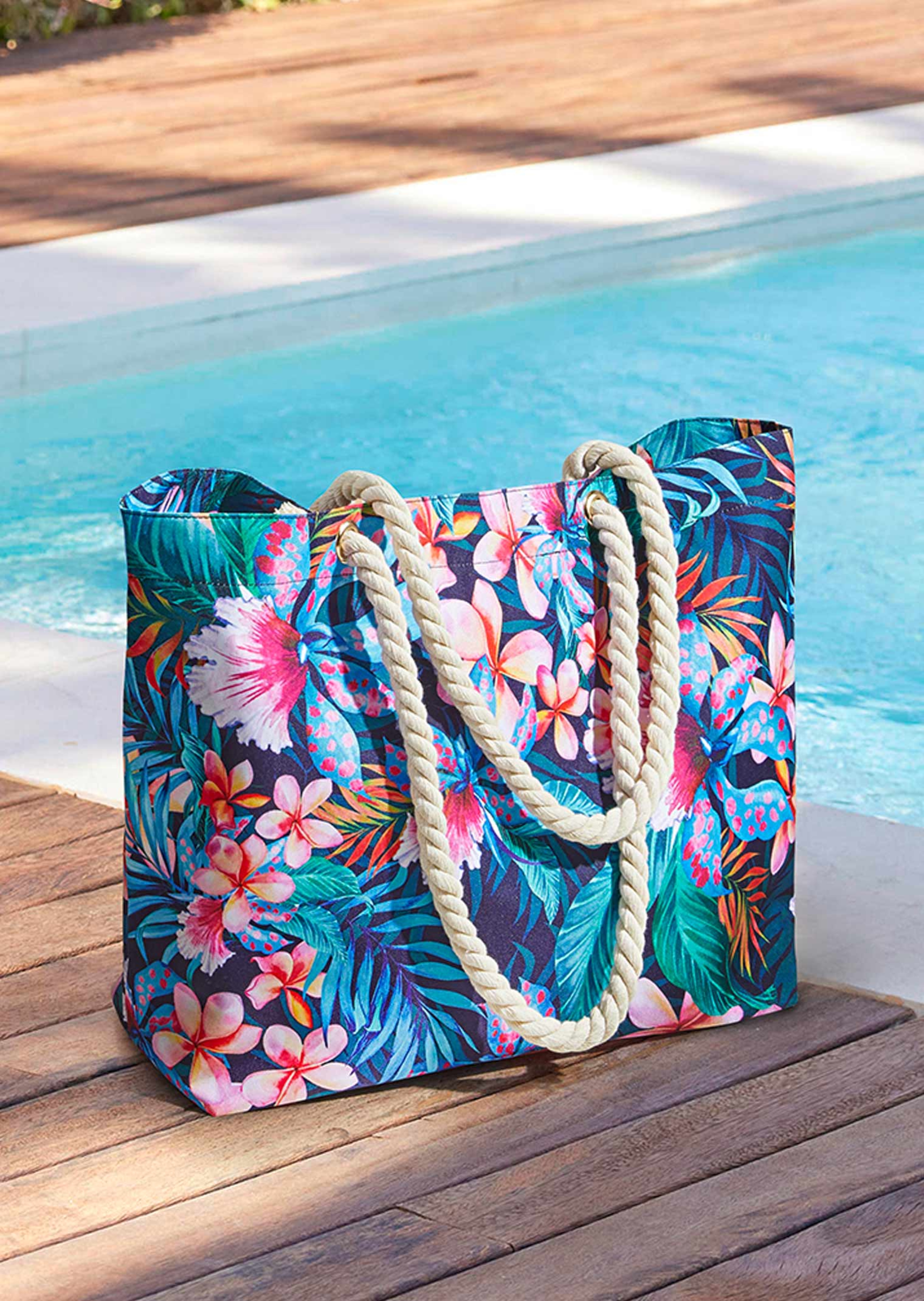Strandtasche mit farbenfrohem Blüten- & Blätter-Dessin. Die brillante Farbgebung macht Lust auf Sommer, Sonne und Meer. Natürlich passt in die geräumige Tasche alles rein, was man am Strand braucht. Die Safety-Innentasche mit Reißverschluss schützt Ihre Wertsachen, in den beiden Futter-Einstecktaschen haben Sie Sonnencreme, Stift & Co. immer griffbereit. Die Tasche lässt sich mit Druckknopf bequem verschließen und dank längerem Henkel in modischer Kontrastfarbe bequem über der Schulter tragen.