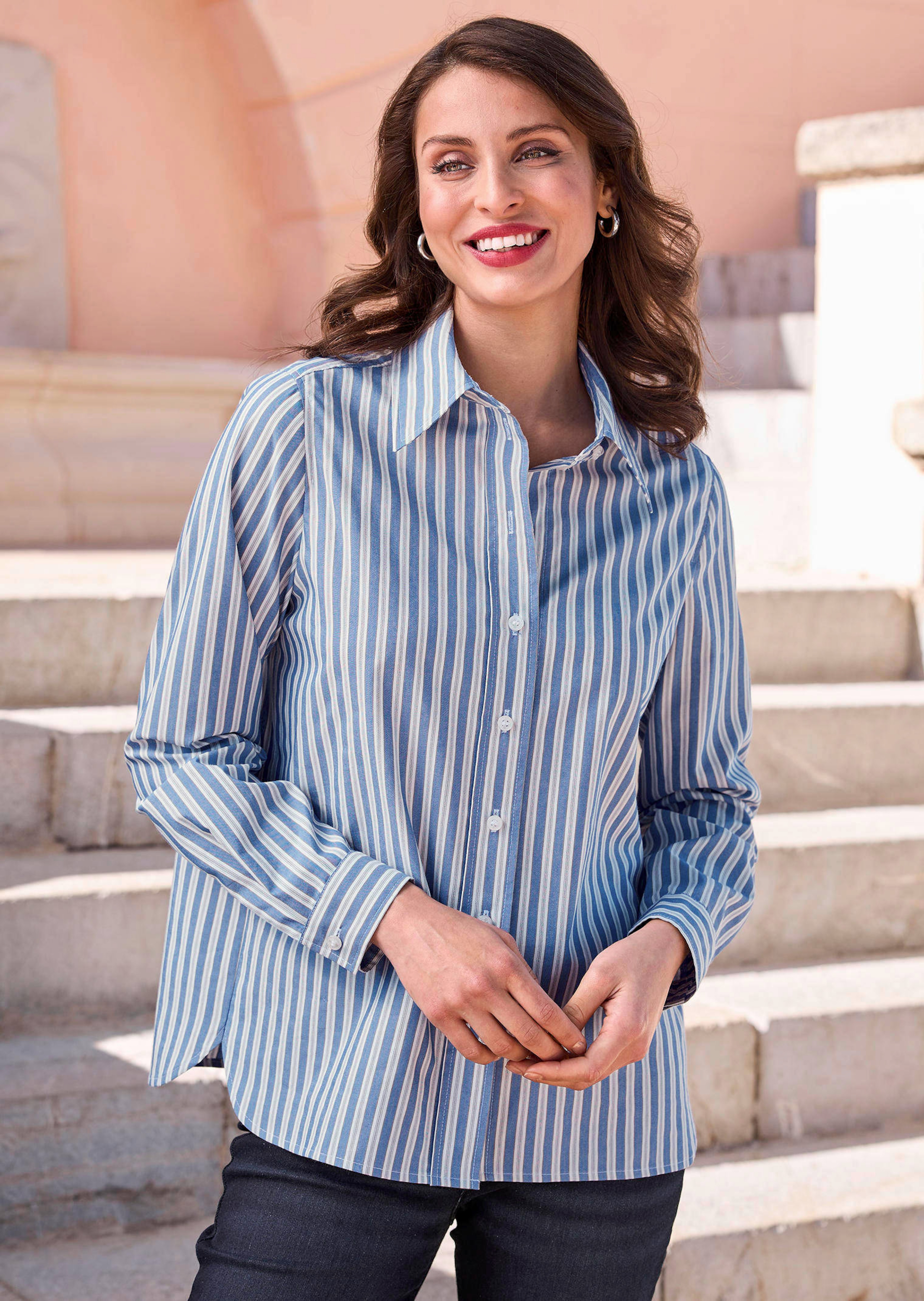 Die klassische Streifen-Hemdbluse von ALBA MODA bekommt durch den lässigen Oversize-Style einen modernen Touch. Die gestreifte Webware mit viel Baumwolle trägt sich angenehm und spricht für die hochwertige Verarbeitung. Mit Hemdblusenkragen und den Manschettenärmeln designt, bleibt die Bluse ihrem klassischen Ursprung treu, während die lockere Passform einen entspannten Wohlfühlkomfort bietet. Die quer gestreifte Schulterpasse im Rückteil ist ein raffiniertes Detail. Länge in Gr. 38 ca. 64 cm. Styling-Tipp: Tragen Sie die Hemdbluse solo für einen klassisch-eleganten Look oder unter einen Pullunder, um Ihrem Outfit eine lässige Note zu verleihen.
