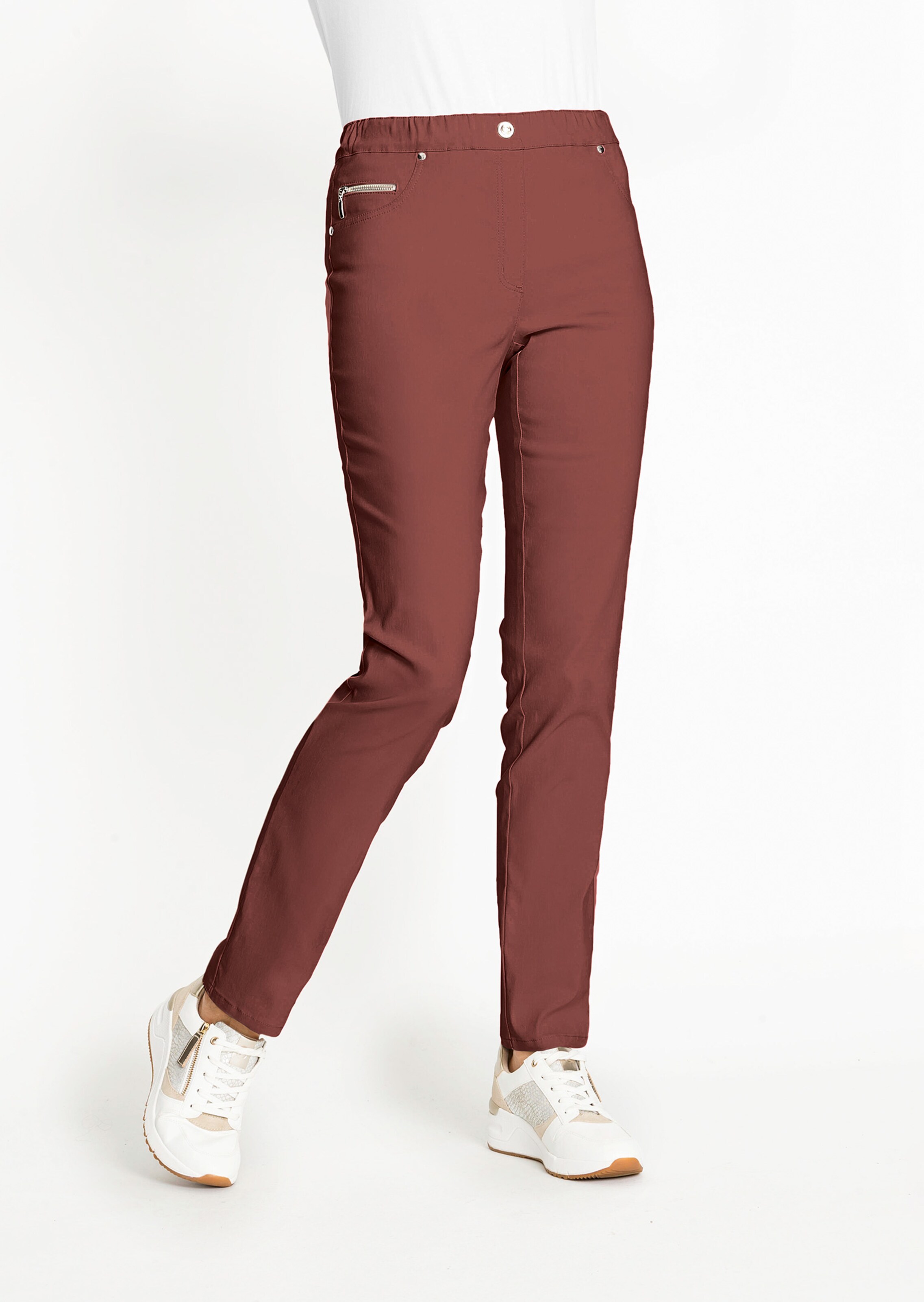 Super-Stretch-Schlupfhose mit Bionic-Finish-Ausrüstung: Ein funktioneller Faserschutz, der sie wasser-, öl- und schmutzabweisend, atmungsaktiv und wunderbar pflegeleicht macht. Der bequeme Rundum-Dehnbund und die Ultra-Stretch-Qualität sorgen für höchsten Komfort und beste Bewegungsfreiheit. Charmante Details wie Zierreißverschlusstaschen, Zierknopf, optischer Reißverschluss und dekorative Nieten vorne setzen modische Akzente. Saumweite ca. 38 cm. Schmale Beinweite.