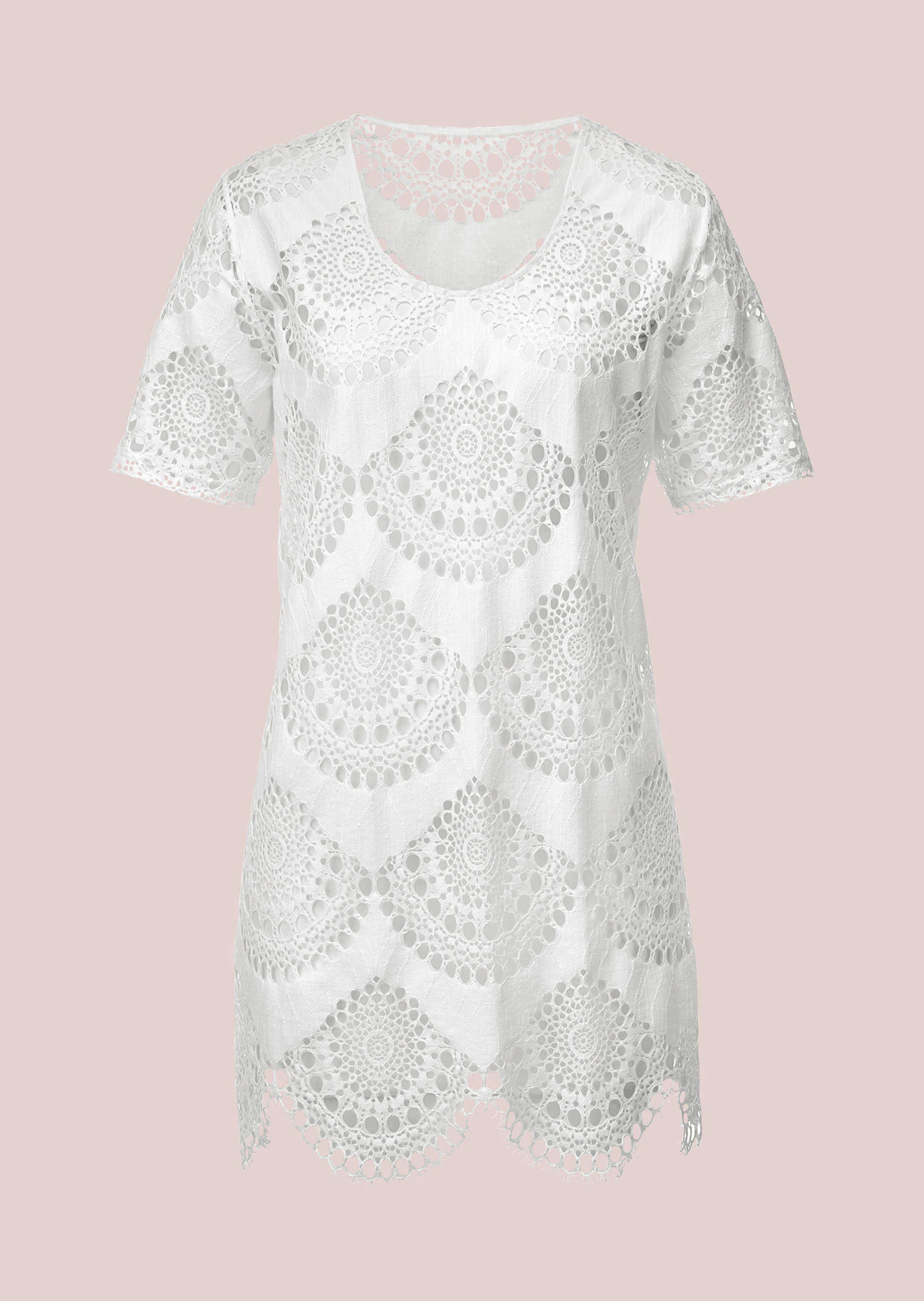 Natürlich, leicht und besonders: Das transparente Tunikakleid von NINA VON C. überzeugt mit lockerem Fall und passt besonders gut über Badeanzug oder Bikini. Der eingefasste Rundhalsausschnitt sorgt für klare Linien, während die aufwendige Lochstickerei und Spitzenbogenkanten am Saum dem Kleid einen feinen, femininen Akzent verleihen. Ideal für entspannte Tage oder legere Sommerausflüge – ein modernes Basic mit Liebe zum Detail.