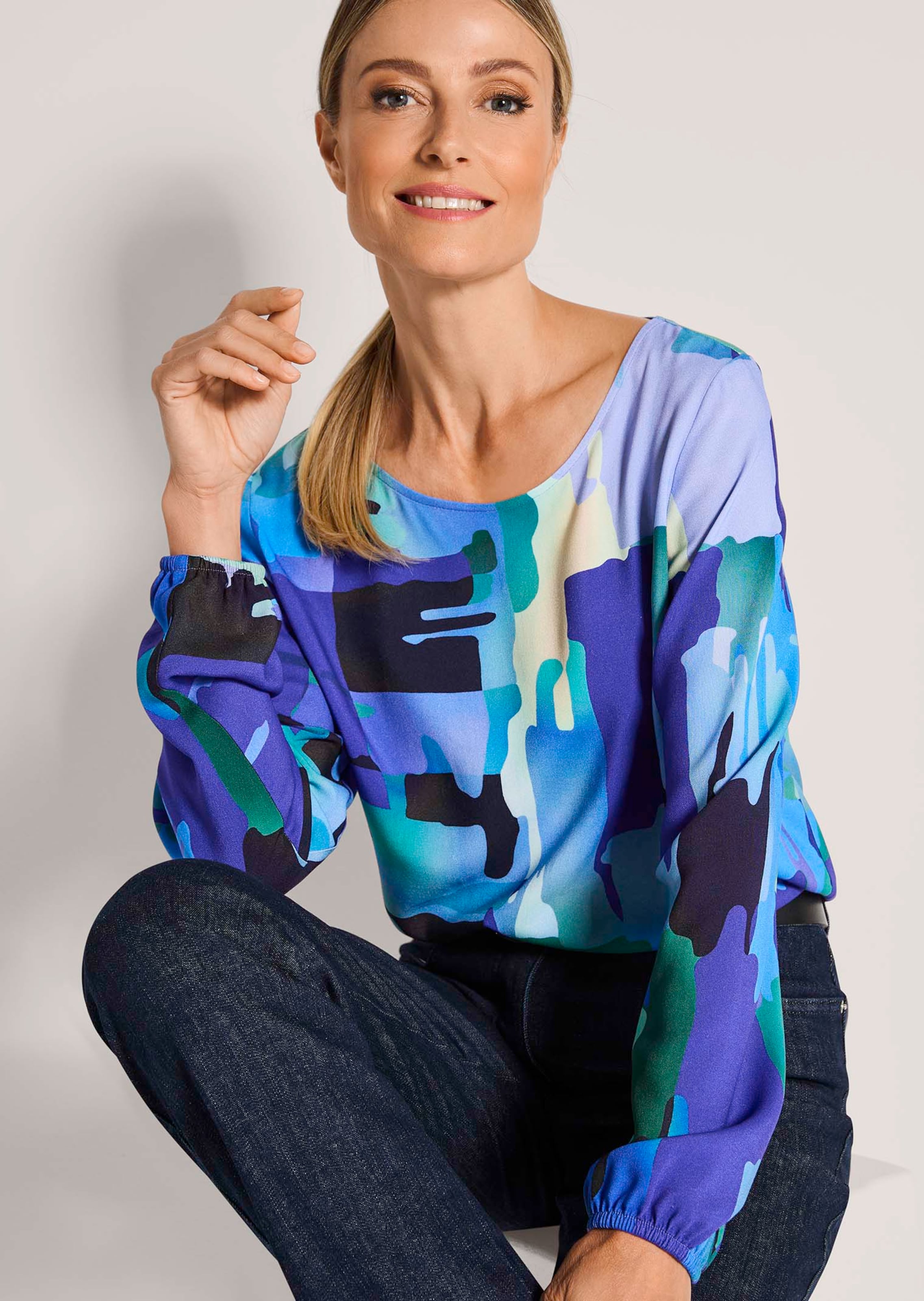 Bluse in figurumspielendem Schnitt – fällt dank reiner Viskose besonders elegant. Mit Rundhalsausschnitt und langen Ärmeln, die sich dank Gummibündchen bequem hochschoppen lassen. Faszinierend: Der Statement-Print in kraftvollem Grafik-Dessin. Länge ca. 67 cm in Gr. 46, ca. 63 cm in Gr. 23.