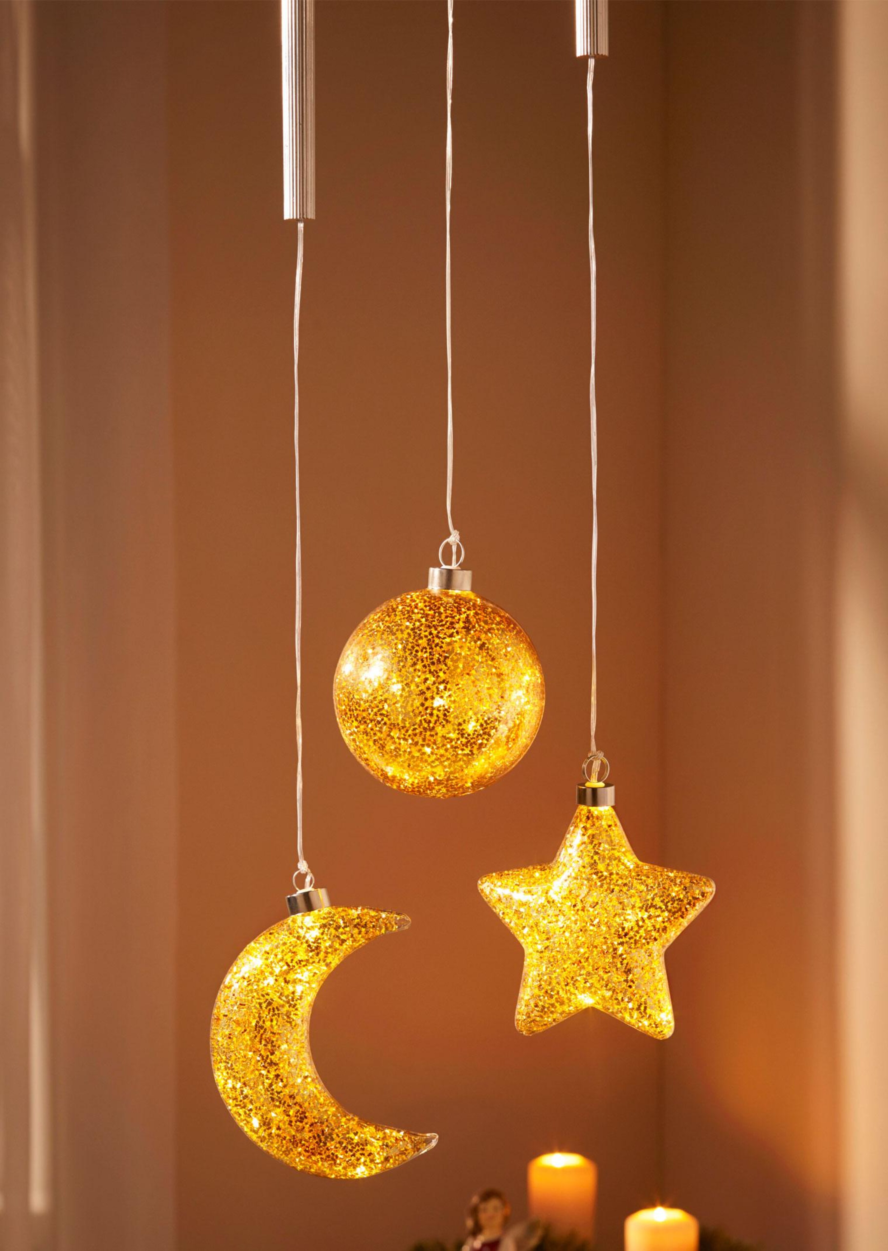 Drie glazen siervoorwerpen. Het goudkleurige accent van de bol, maan en ster komt door het warme licht van de ledverlichting bijzonder mooi uit. De winter- en kerstversiering is dankzij de batterijvoeding overal op te hangen of neer te leggen. Batterijen niet inbegrepen. Afmetingen: bol Ø 12 cm, ster Ø 15 cm, maan hoogte 16 cm.