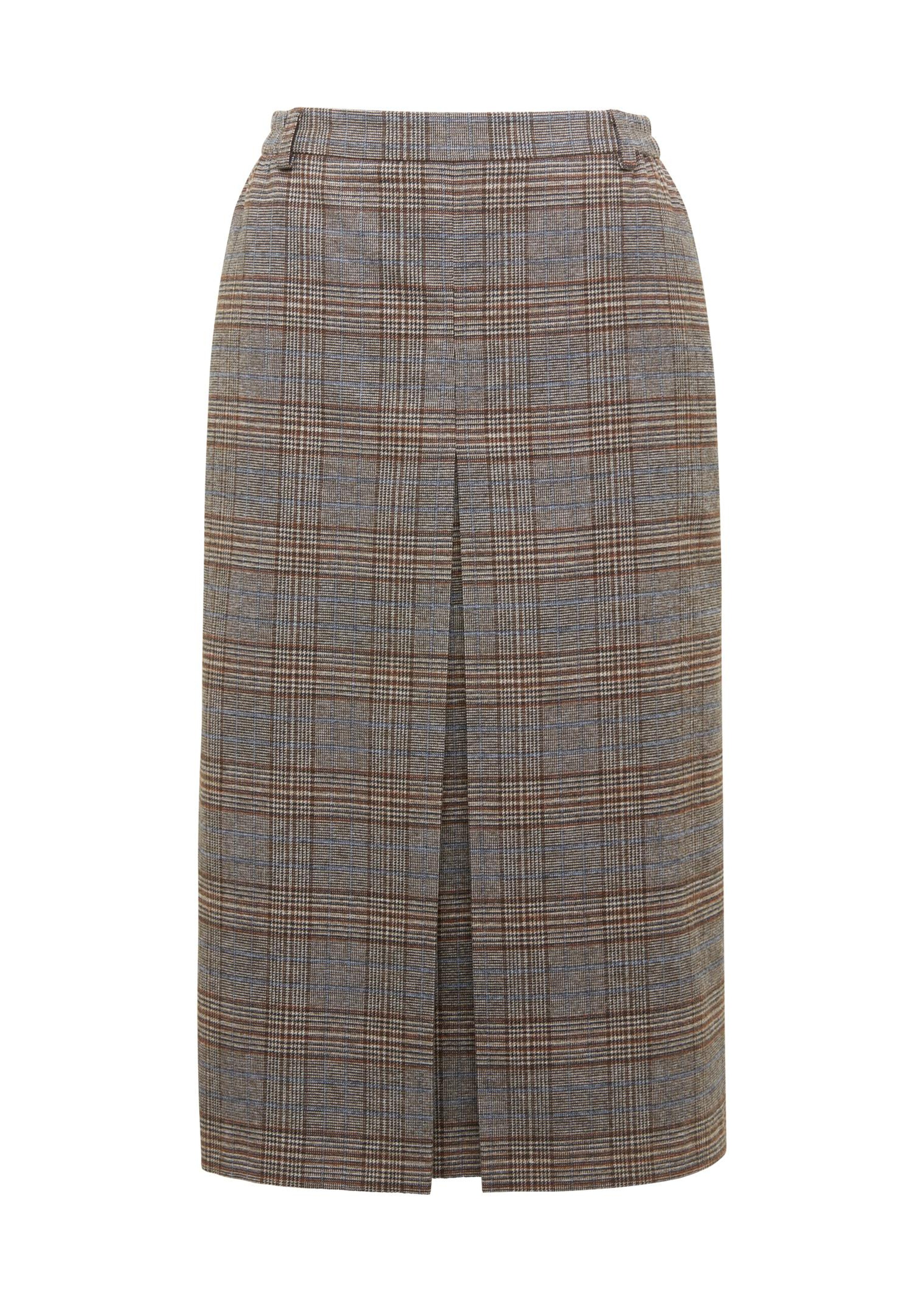 Geruite rok in iets zwierig A-model. Het prachtige ruitdessin is hier uitgevoerd in aantrekkelijke bruin- en blauwtinten en is prima te combineren. Het flanelachtige, winterse materiaal is zacht en daardoor heel prettig in het dragen. Voor in het midden is de rok voorzien van een permanente stolpplooi. Dit model is geheel gevoerd en heeft een comfortabele, deels elastische tailleband en riemlussen.