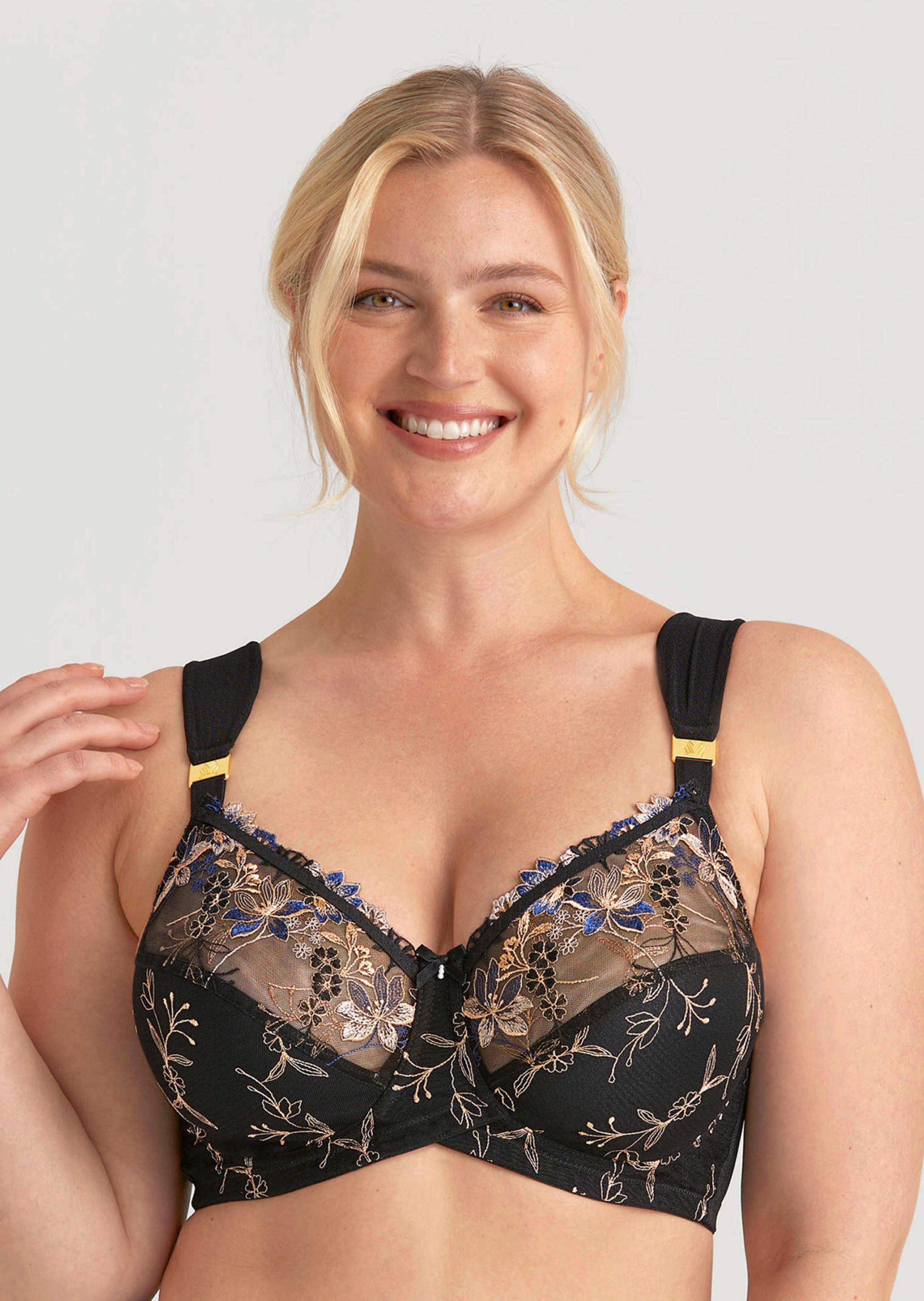 Beugelbeha van MISS MARY met luxueus geborduurde tule en goudkleurige details. De onderste cuphelften zijn met glanzende charmeuse tegengevoerd. Rug van elastische power-tule. Verstelbare, gewatteerde bandjes en drievoudig verstelbare haakjessluiting.
