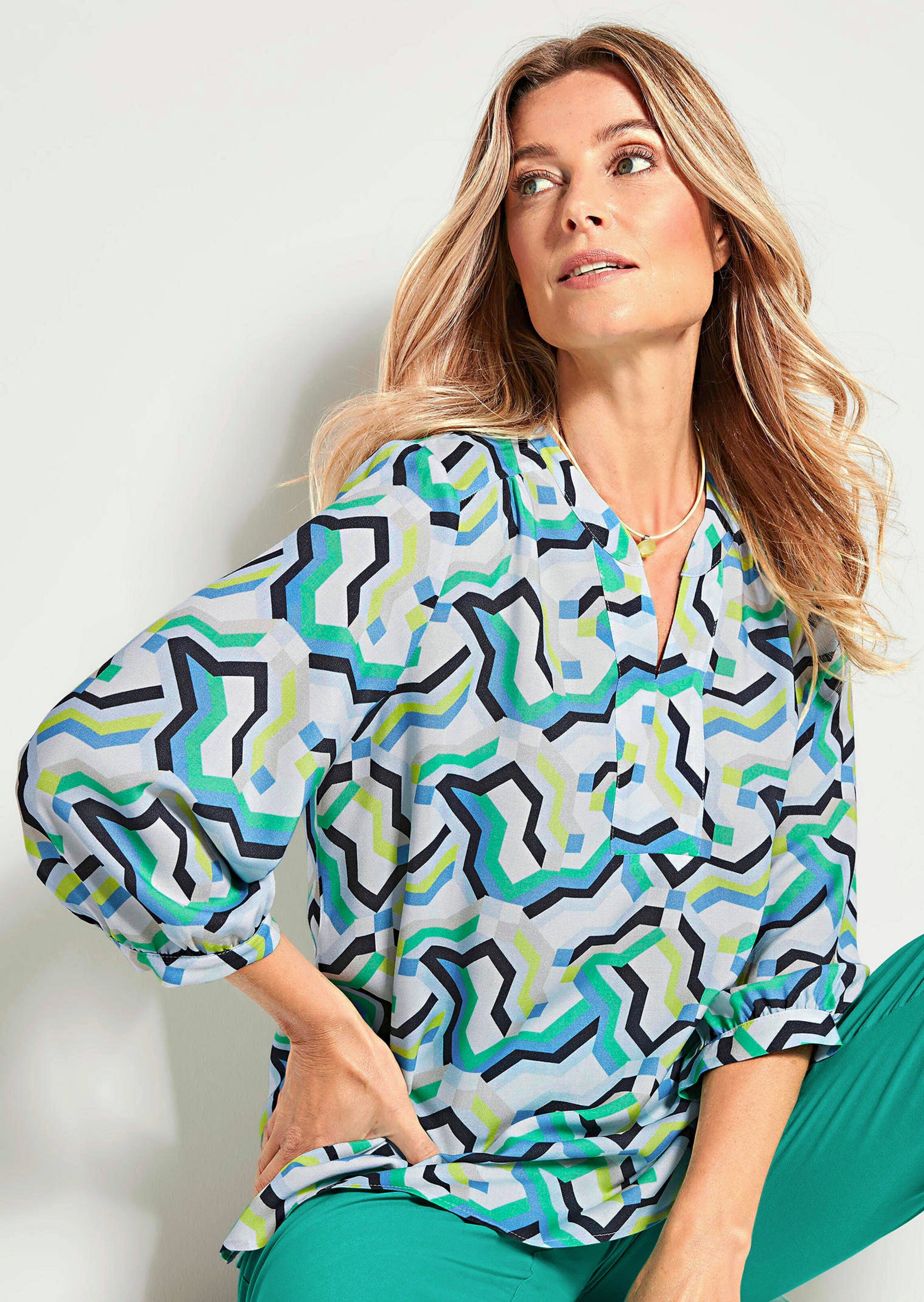 Blouse in tuniekstijl. De ronde hals met een splitje heeft een vormgevende strook. De rimpeling aan de smalle schouderpas geeft de blouse een speels accent. De 3/4-mouwen hebben een manchet met knoop en splitje. De over de heupen vallende blouse met zijnaadsplitten overtuigt met een comfortabele, wijde pasvorm. Het motief allover in kleurrijke nuances zorgt voor een moderne, modieuze look. Lengte ca. 71 cm in maat 46, ca. 67 cm in maat 23.