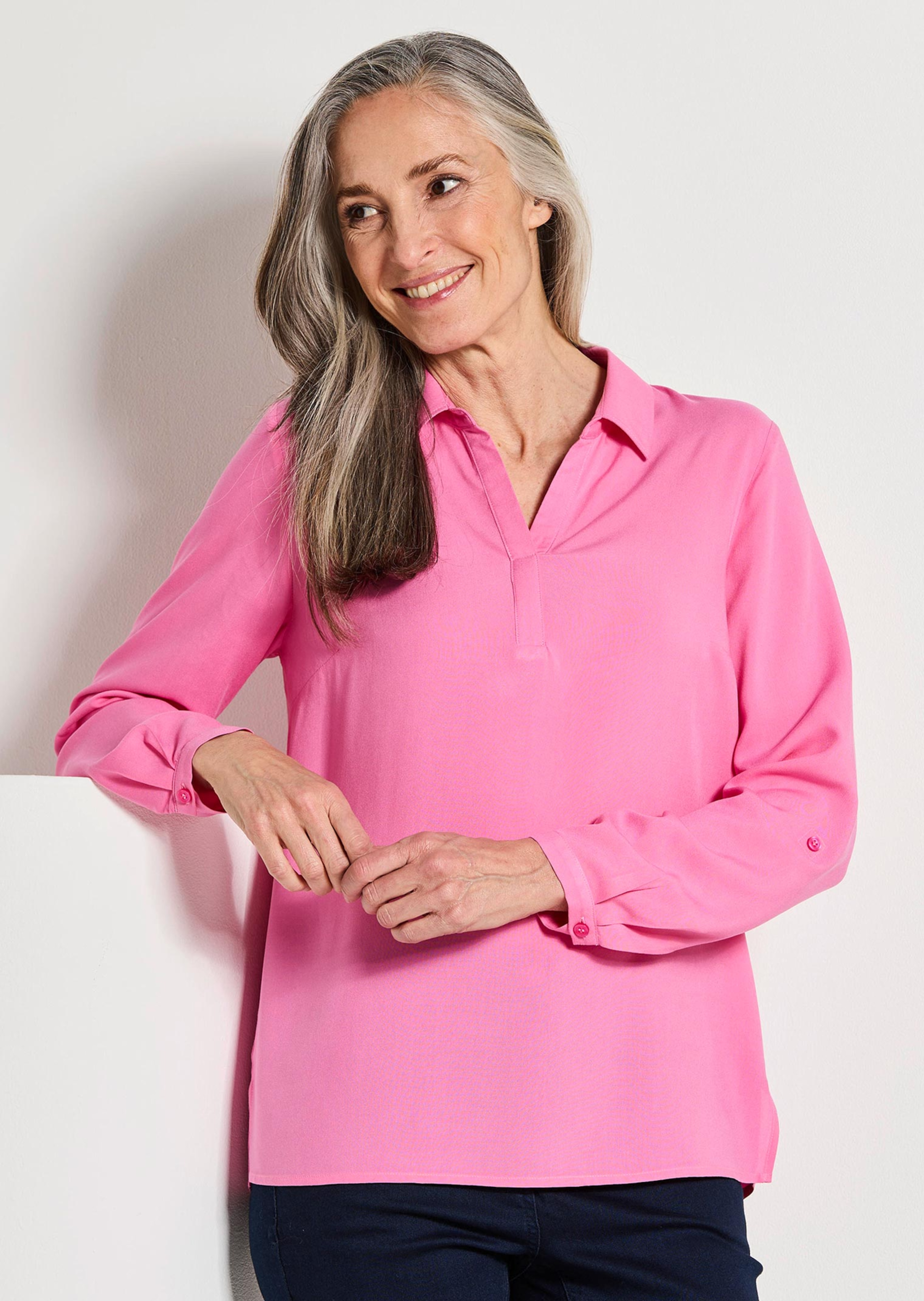 Blouse van soepele viscose. Het praktische model zonder sluiting met een pas achter en plooi achter heeft een comfortabele wijdte en is perfect om ergens over of onder te dragen. Open overhemdkraag en strook bij de hals. De lange mouwen met manchet kunnen worden omgeslagen en met een trensje worden vastgezet. Met splitjes in de zijnaden. Een basic die in geen enkele garderobe mag ontbreken! Lengte ca. 69 cm in maat 46, ca. 65 cm in maat 23.