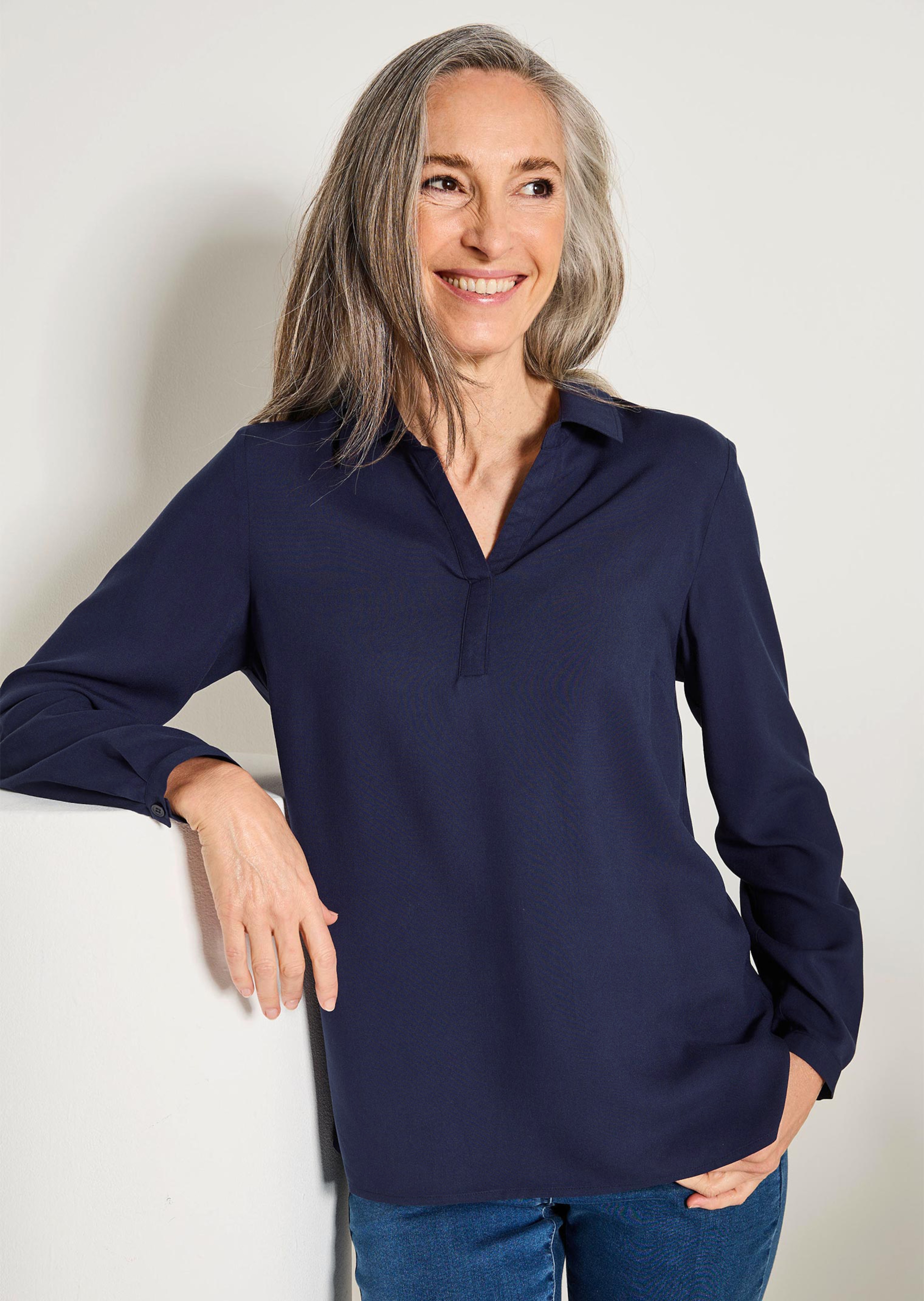 Blouse van soepele viscose. Het praktische model zonder sluiting met een pas achter en plooi achter heeft een comfortabele wijdte en is perfect om ergens over of onder te dragen. Open overhemdkraag en strook bij de hals. De lange mouwen met manchet kunnen worden omgeslagen en met een trensje worden vastgezet. Met splitjes in de zijnaden. Een basic die in geen enkele garderobe mag ontbreken! Lengte ca. 69 cm in maat 46, ca. 65 cm in maat 23.