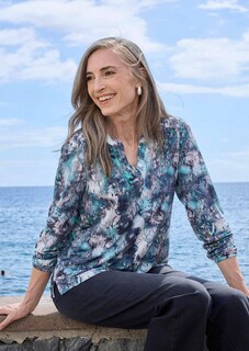 Jerseyblouse in een modieuze verscheidenheid aan dessins: de rijk gevarieerde all-over dessins maken deze zeer smaakvolle creatie tot een gewild combinatiemodel. Mooie details zijn de smalle schouderpas met charmante aanrimpeling en de diepe, elegante V-hals. Het hoogwaardige, aangename slinky laat de kleuren helder stralen. Met Elastan voor optimale bewegingsvrijheid. Lengte ca. 69 cm in maat 46, ca. 65 cm in maat 23.