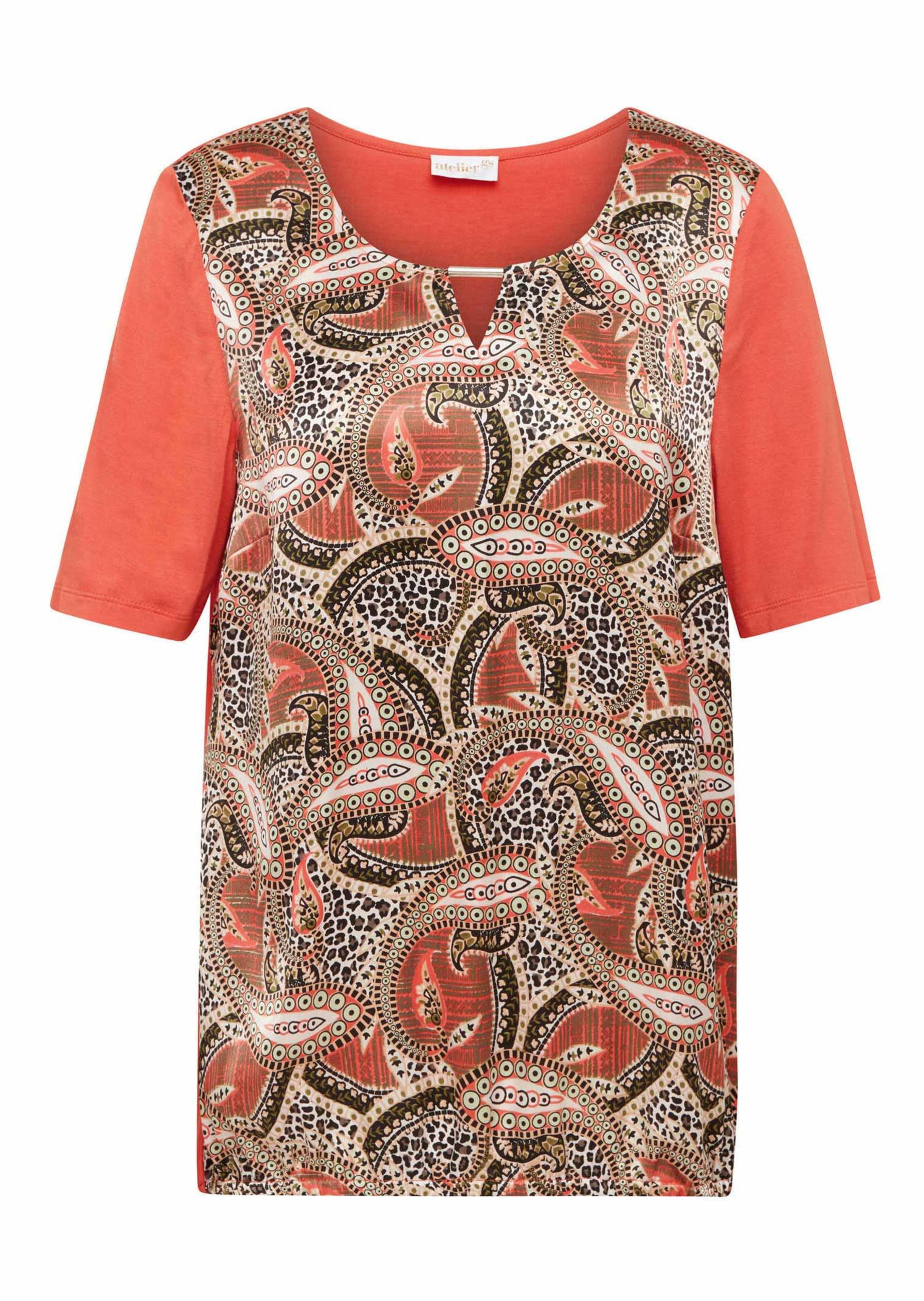 Blouseshirt in spannende materiaalmix: de voorkant is van gesatineerde weefstof en valt in de smaak door de schitterende print. Voor aangenaam comfort zijn mouwen en rug gemaakt van viscose-jersey. Ronde hals met split met titaniumkleurig detail als blikvanger. Korte mouwen en elastiek in de zoom voor een flatteus effect. Lengte ca. 66 cm in maat 46, ca. 62 cm in maat 23.
