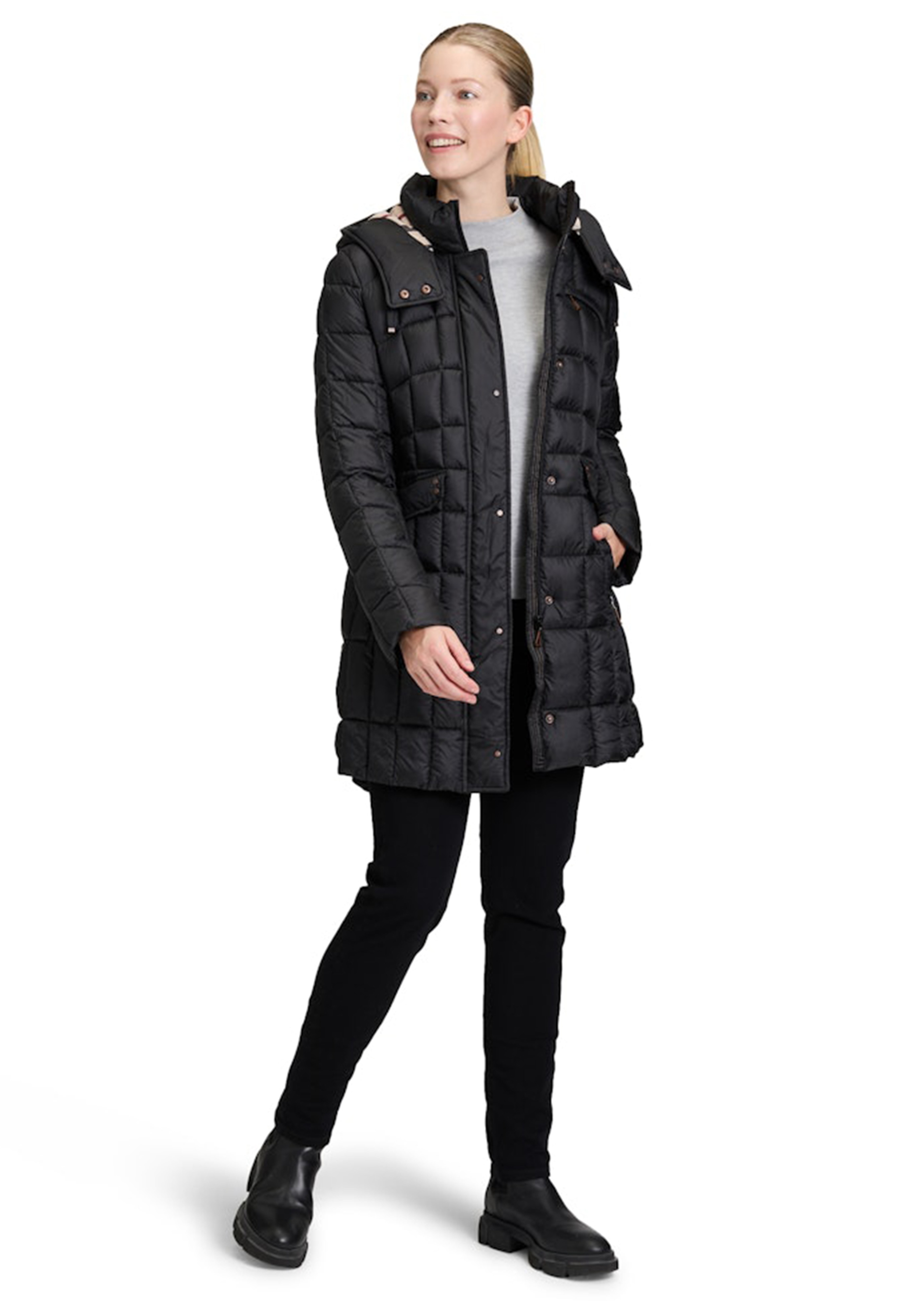 Doorgestikte mantel met capuchon van GIL BRET in subtiel glanzende look, dik gevoerd met warm imitatiedons. Deze lange jas met modieuze ruitstiksels en een geruite capuchonvoering maakt modieus gezien indruk. Al naargelang de weersomstandigheden is de capuchon ook afneembaar. Zowel de warm gevoerde steekzakken als de borstzak zijn voorzien van een ritssluiting, decoratieve kleppen maken de look mooi af. Met verborgen jersey boord aan de mouwen en drukknoopsluiting boven de ritssluiting als extra bescherming tegen kou. In alle opzichten een mooie mantel waarin u prima de winter doorkomt! Rechte pasvorm met afgeronde zoom. Lengte ca. 90 cm in maat 46.