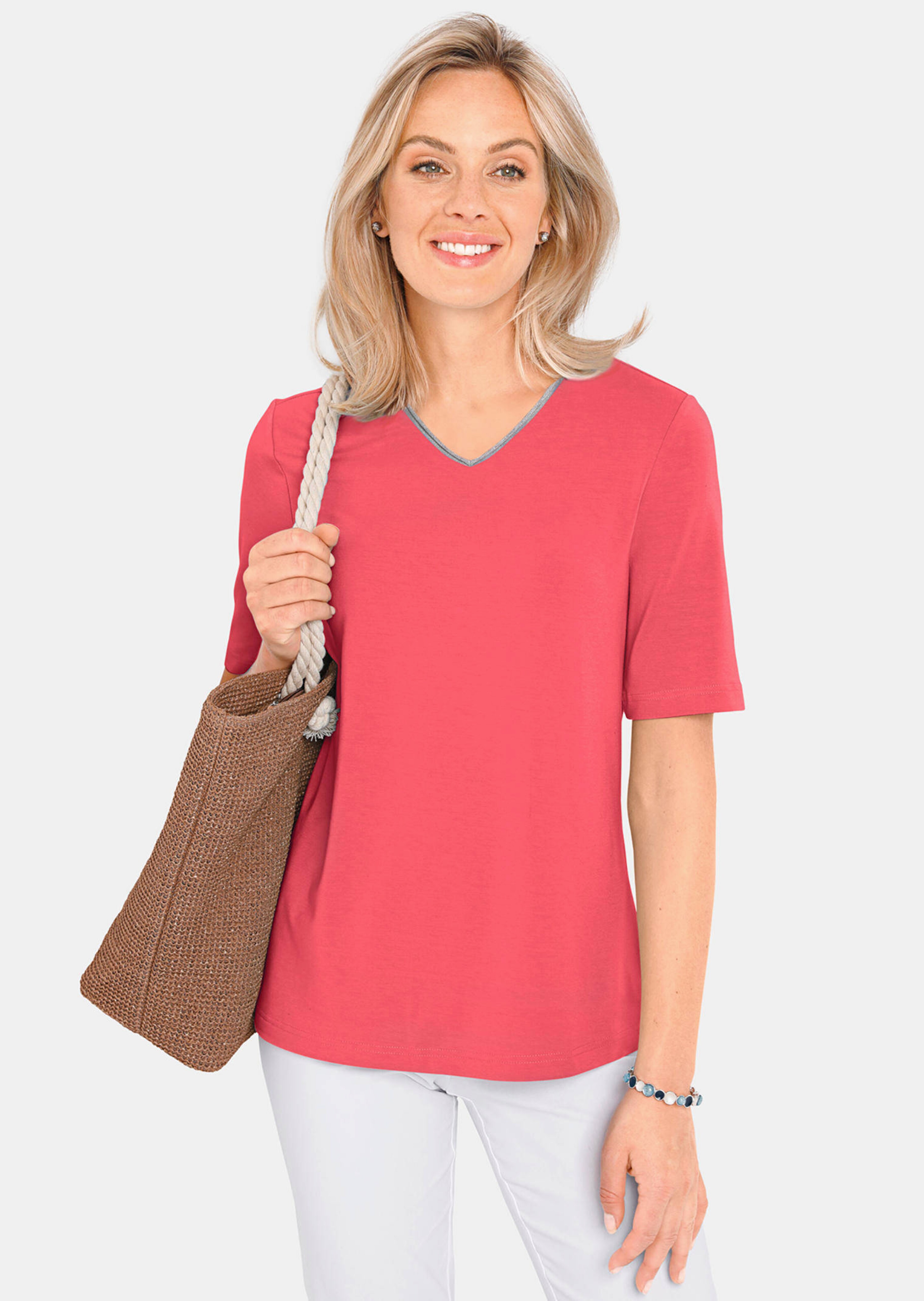 Shirt met V-hals, die elegant door een zilverkleurige rolrand benadrukt wordt. Een leuke favoriet voor al uw lievelingscombinaties dit seizoen. De hoogwaardige, onderhoudsarme materiaalsamenstelling is aangenaam licht in het dragen. Bovendien is het aangenaam koel op warme dagen en is het heerlijk warm bij koel weer. In betoverend mooie, frisse kleuren. Lengte ca. 64 cm in maat 46, ca. 60 cm in maat 23.