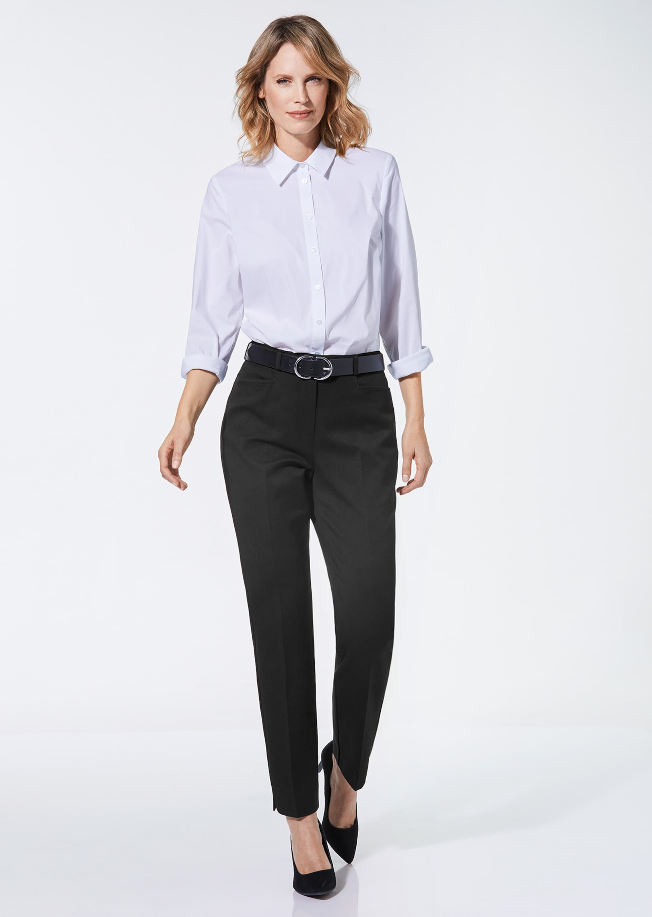De corrigerende broek Adelina by Scheiter met een verstevigde tailleband combineert tijdloze elegantie met praktisch comfort. Perfect voor iedereen die graag stijlvolle, comfortabele kleding voor elke dag draagt. De broek van bi-elastische stretch, biedt maximale bewegingsÂvrijheid en garandeert een optimale pasvorm bij buik, benen, billen en taille. Het uitstekende draagcomfort maakt de broek ideaal om dagelijks te dragen. Met klassieke, gestreken vouwen en steekzakken. Zeer onÂgecompliceerd dankzij het gemakkelijk te onderhouden materiaal. Voetwijdte ca. 36 cm. Smalle pijpen.