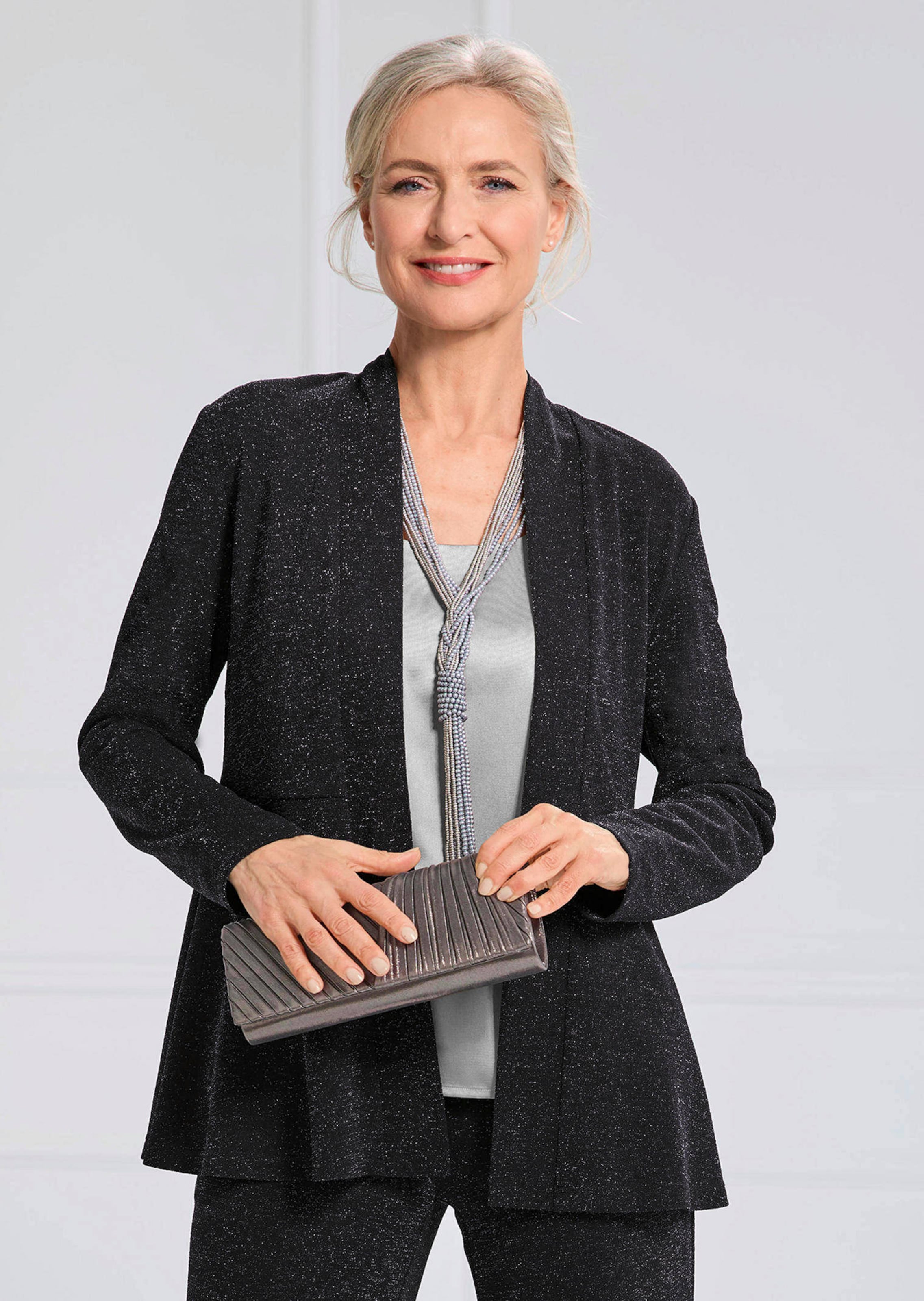 Jersey jasje in een iets verlengd, open model. Een taillenaad zorgt voor een elegant silhouet. Het iets uitlopende model heeft een mooie zwierigheid. Met flatteuze sjaalkraag en lange mouwen. Zachte jersey met glansgaren – irriteert ook aan de binnenkant niet. Lengte ca. 71 cm in maat 46, ca. 67 cm in maat 23.