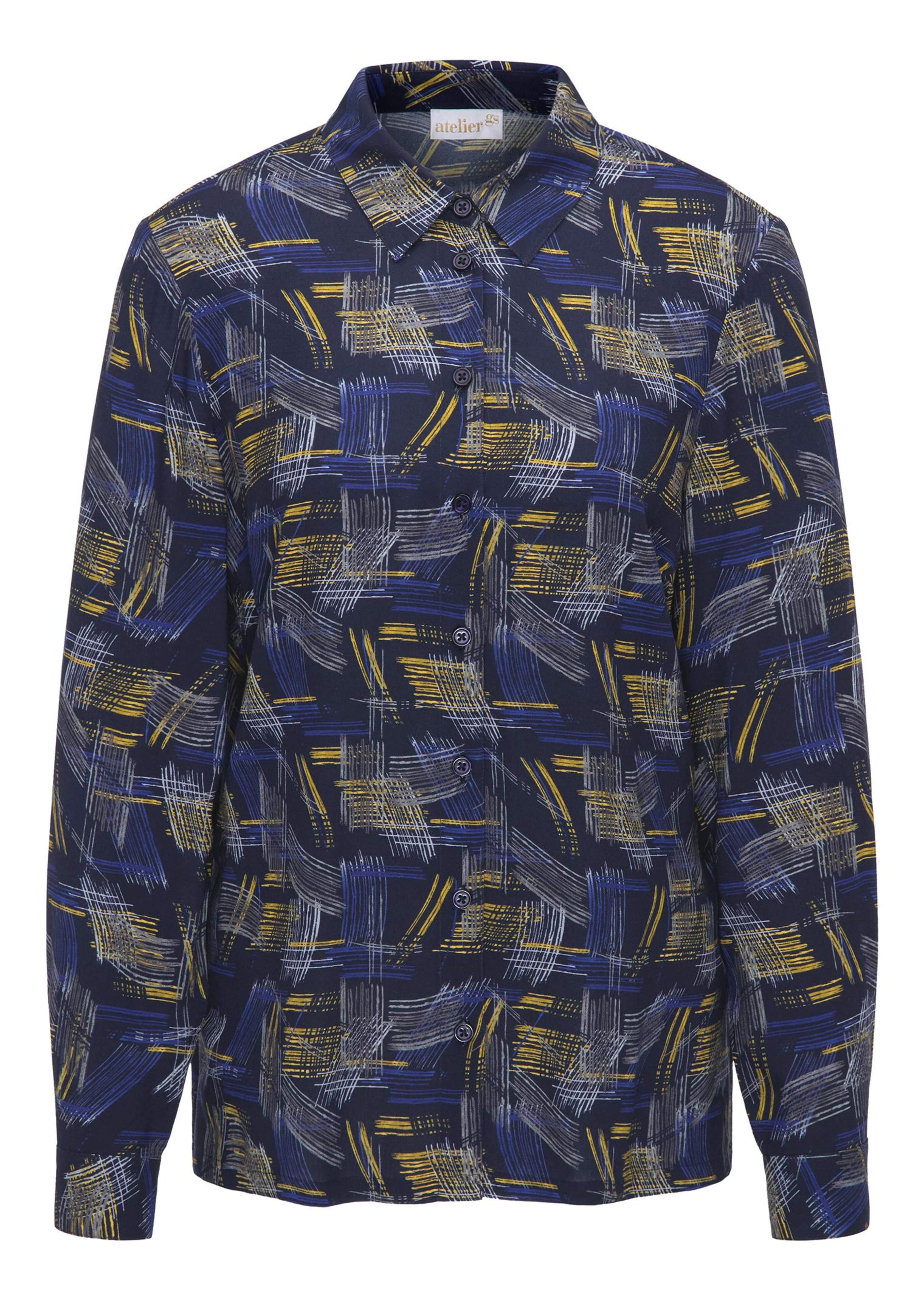 Gedessineerde blouse met dessin allover. De grafische print in stralende kleuren bezorgt het model zijn geheel eigen karakter. Zeer comfortabel. Geweven stof met viscose. Afgewerkt met manchetten met één knoop en een splitje en figuurnaden op de borst voor een goede pasvorm. Lengte ca. 66 cm in maat 46, ca. 62 cm in maat 23.