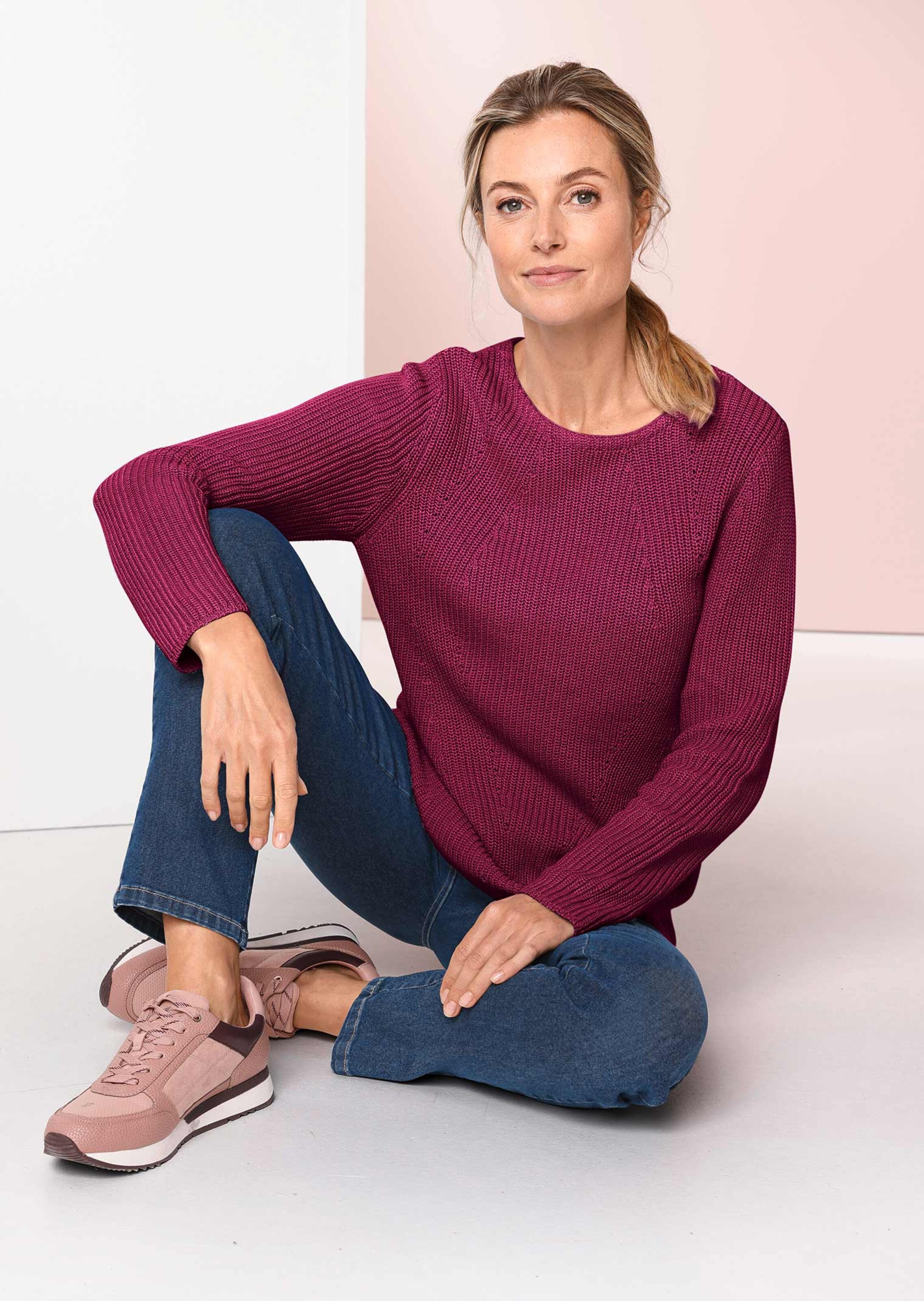 Pullover met een aantrekkelijke belijning voor, voor een prachtig, elegant silhouet. Het grove patentbreisel en een betoverend mooie, moderne boothals geven het buitengewone model een geweldig look. Mooi in model blijvend en aangenaam van puur katoen. De pullover zorgt voor uitstekend draagcomfort. Hij is in model gebreid en garandeert daardoor een perfecte pasvorm. Lengte ca. 67 cm in maat 46, ca. 63 cm in maat 23.