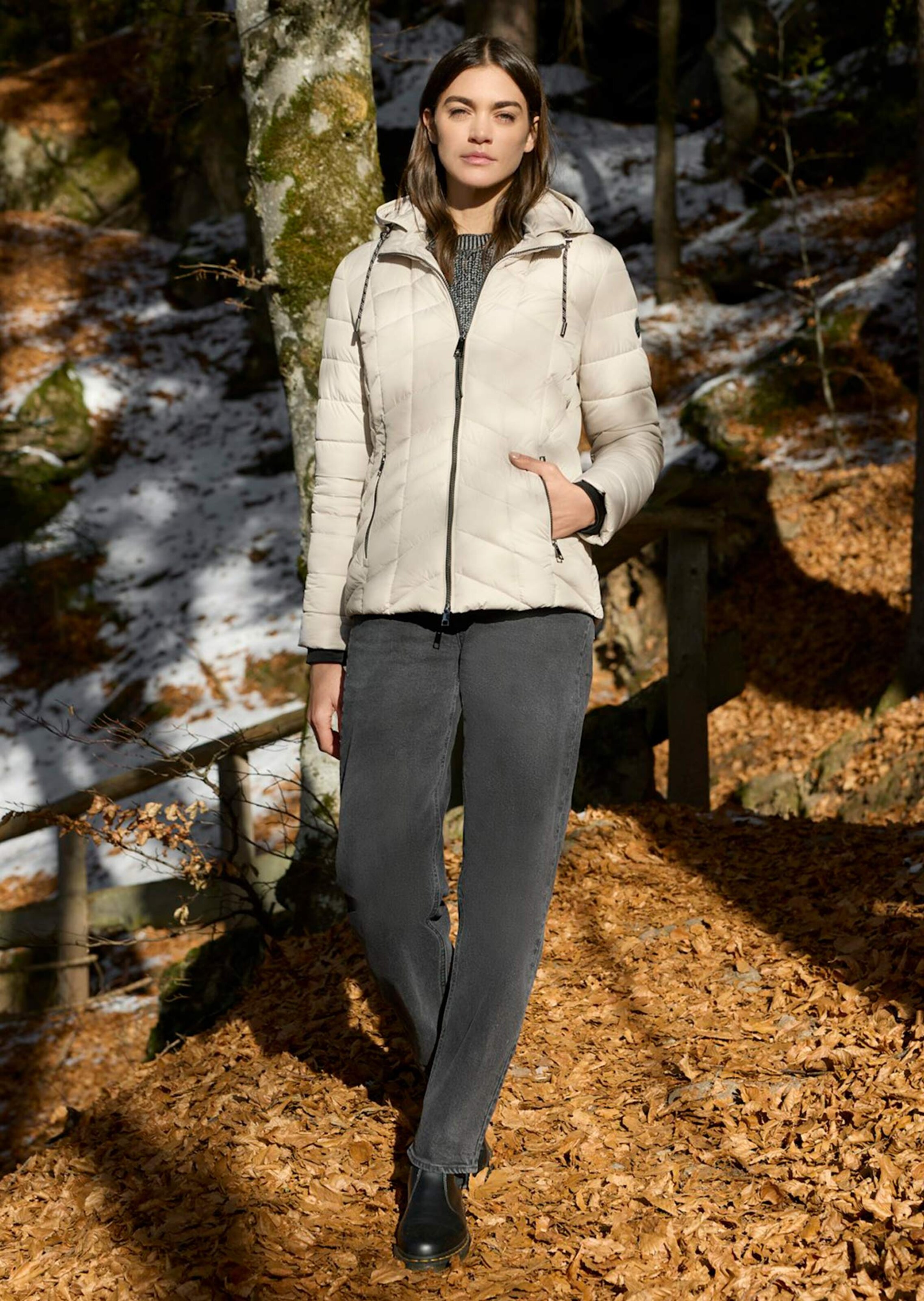 Gewatteerd jack met capuchon van BARBARA LEBEK in extra licht model. De donsvrije wattering is extreem licht in het dragen en toch heerlijk warm. Het ruitstiksel flatteert en de donkere accessoires brengen pit in de verzorgde look. Met een afneembare capuchon met koordjes, 2-wegritssluiting, twee zakken met ritssluiting en een zakje in de voering. Het jack is actief ademend, winddicht en waterafstotend. Elastische jersey mouwboorden bieden extra bescherming tegen kou. Lengte ca. 70 cm in maat 46.