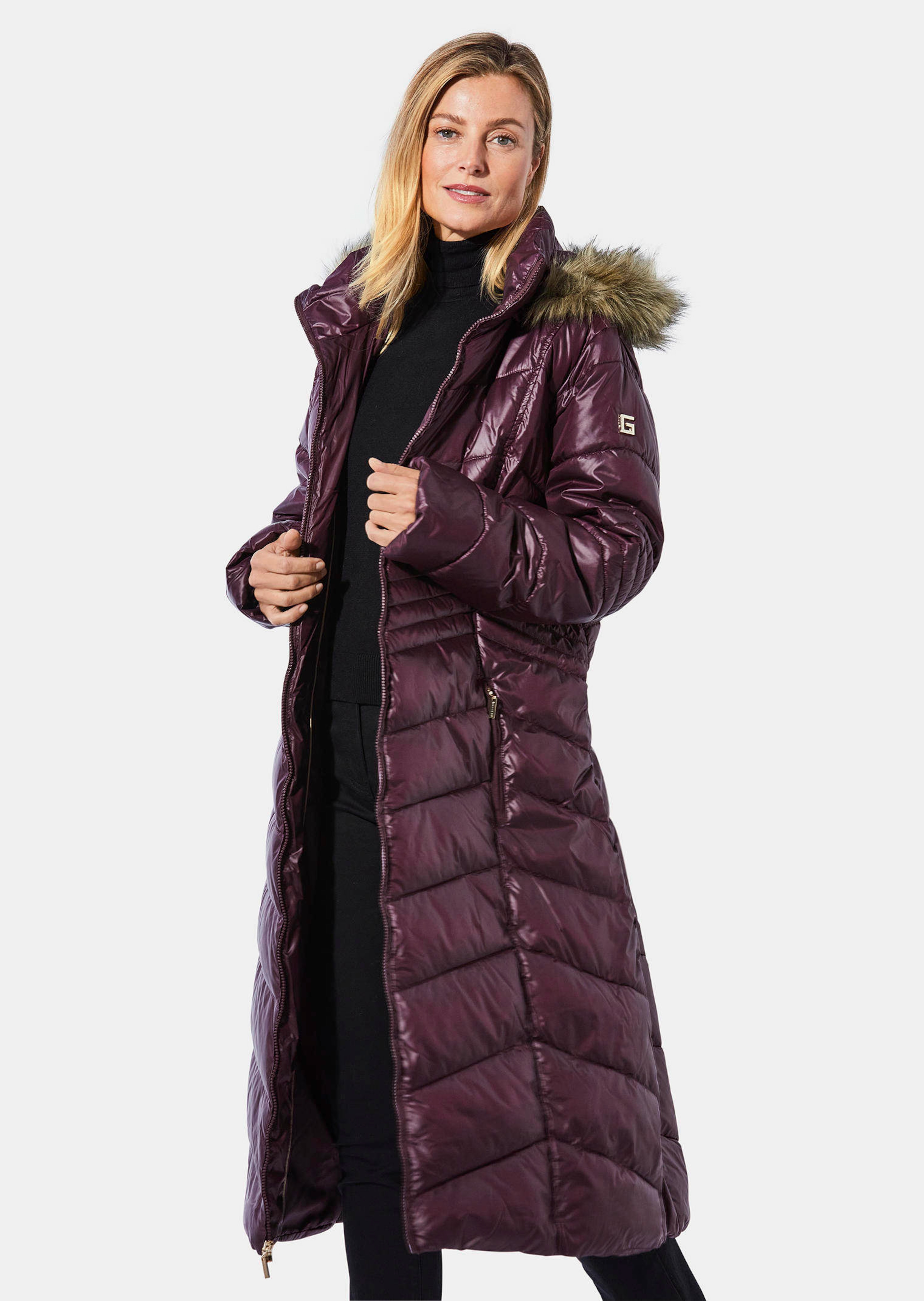 Gewatteerde mantel, die dankzij zijn lengte tot de kuit en de warme wattering beschermt – perfect voor koude dagen. Met chic chevron-stikselpatroon dat u slanker laat lijken: de diagonale lijn van de stiknaden en de smalle stiksels in de taille zorgen voor een prachtig slanker figuur. Steekzakken met ritssluiting zijn praktisch en maken niet dik. Een 2-wegritssluiting biedt u verschillende manieren om de mantel te sluiten. De afneembare capuchon met beleg van imitatiebont en een opstaand kraagje ronden het totaalbeeld van deze modieuze mantel perfect af. Dit model valt een maat kleiner uit. U kunt deze mantel het beste een maat groter bestellen.