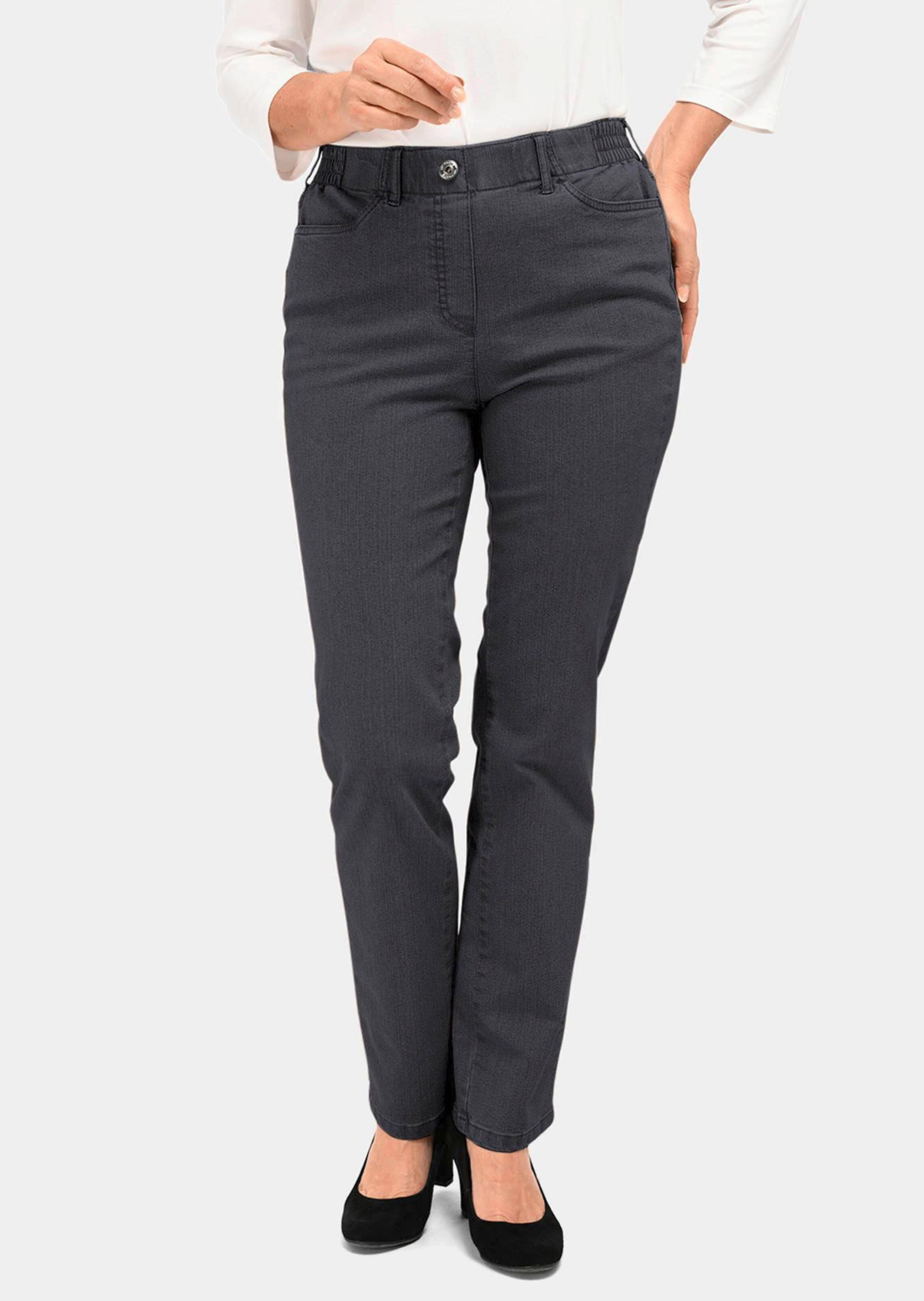 Jeans van comfortabele stretchmateriaal. Het model is bi-elastisch en zorgt voor veel bewegingsvrijheid. Met afgeronde steekzakken voor en twee achterzakken, versierd met studs. Een zadelpas achter zorgt voor een perfecte pasvorm. Met een comfortabele elastische tailleband met een vast inzetstuk voor. Hierdoor tekent niets af en geniet u van uniek draagcomfort. Voetwijdte ca. 42 cm. Rechte pijpen.