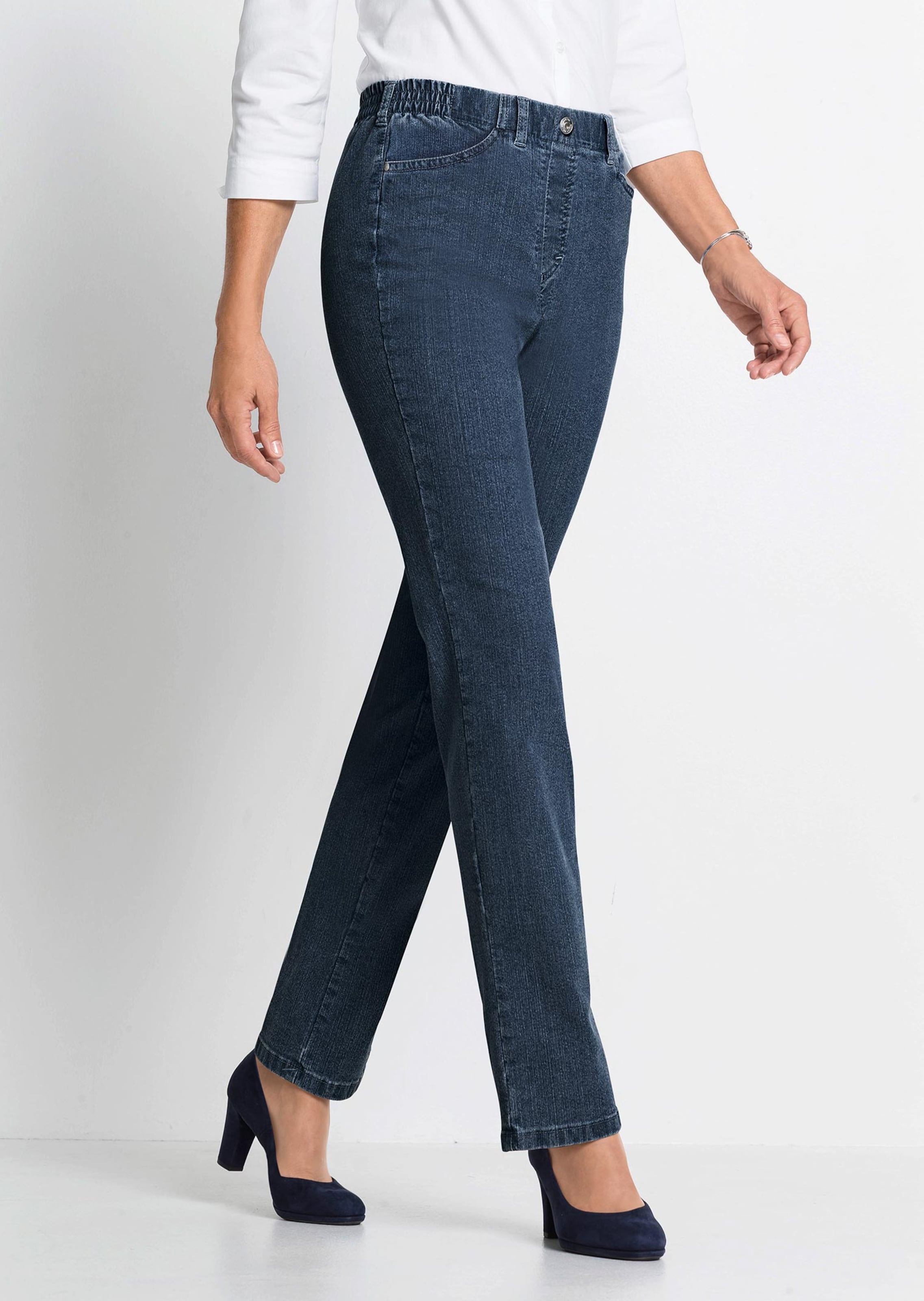 Jeans van comfortabele stretchmateriaal. Het model is bi-elastisch en zorgt voor veel bewegingsvrijheid. Met afgeronde steekzakken voor en twee achterzakken, versierd met studs. Een zadelpas achter zorgt voor een perfecte pasvorm. Met een comfortabele elastische tailleband met een vast inzetstuk voor. Hierdoor tekent niets af en geniet u van uniek draagcomfort. Voetwijdte ca. 42 cm. Rechte pijpen.