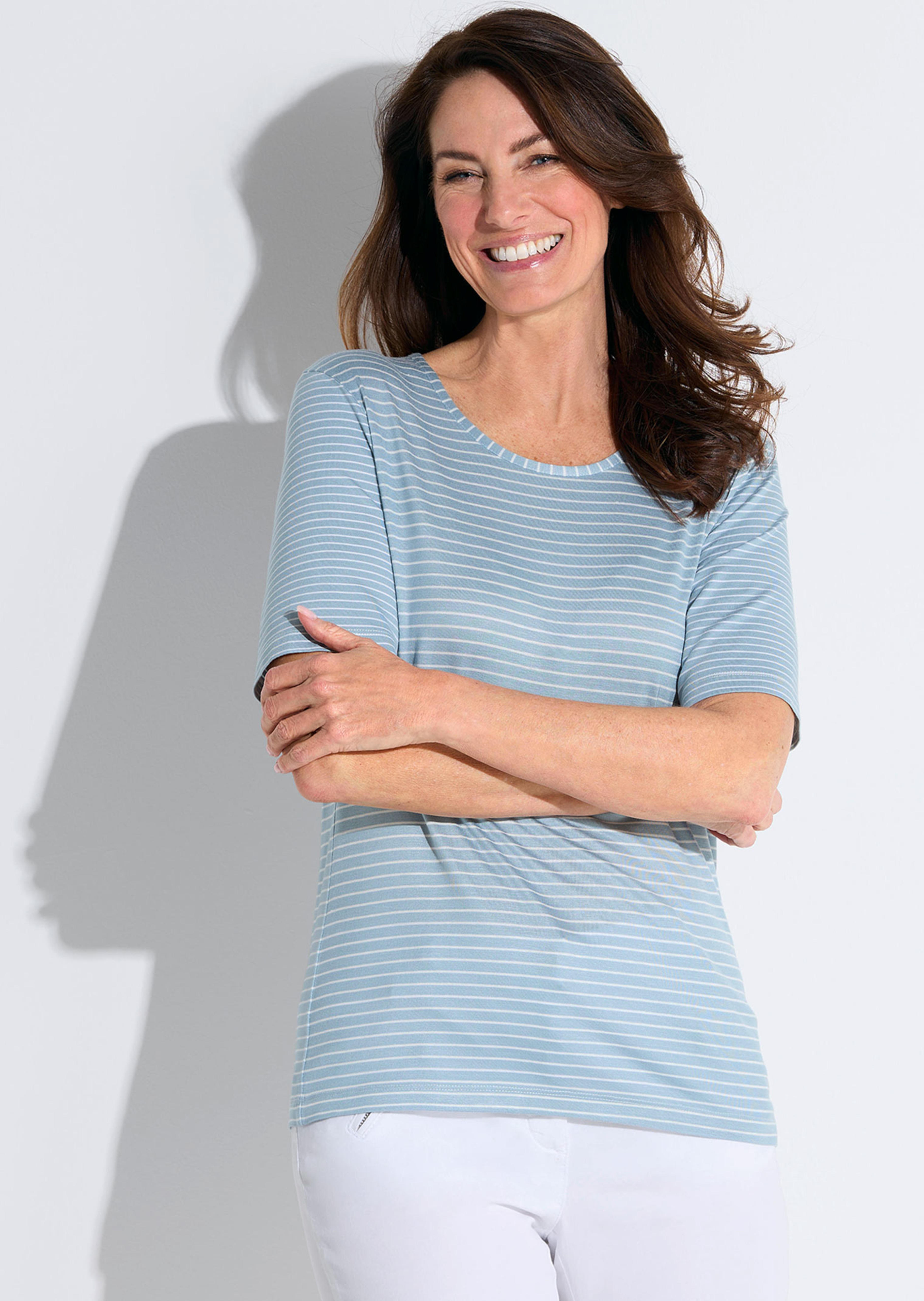 Shirt in zachte, gestreepte look. De bies bij de ronde hals is uitgevoerd met verticale strepen. Comfortabel en huidvriendelijk dankzij zachte viscose-jersey. Met korte mouwen. Lengte ca. 64 cm in maat 46, ca. 60 cm in maat 23.