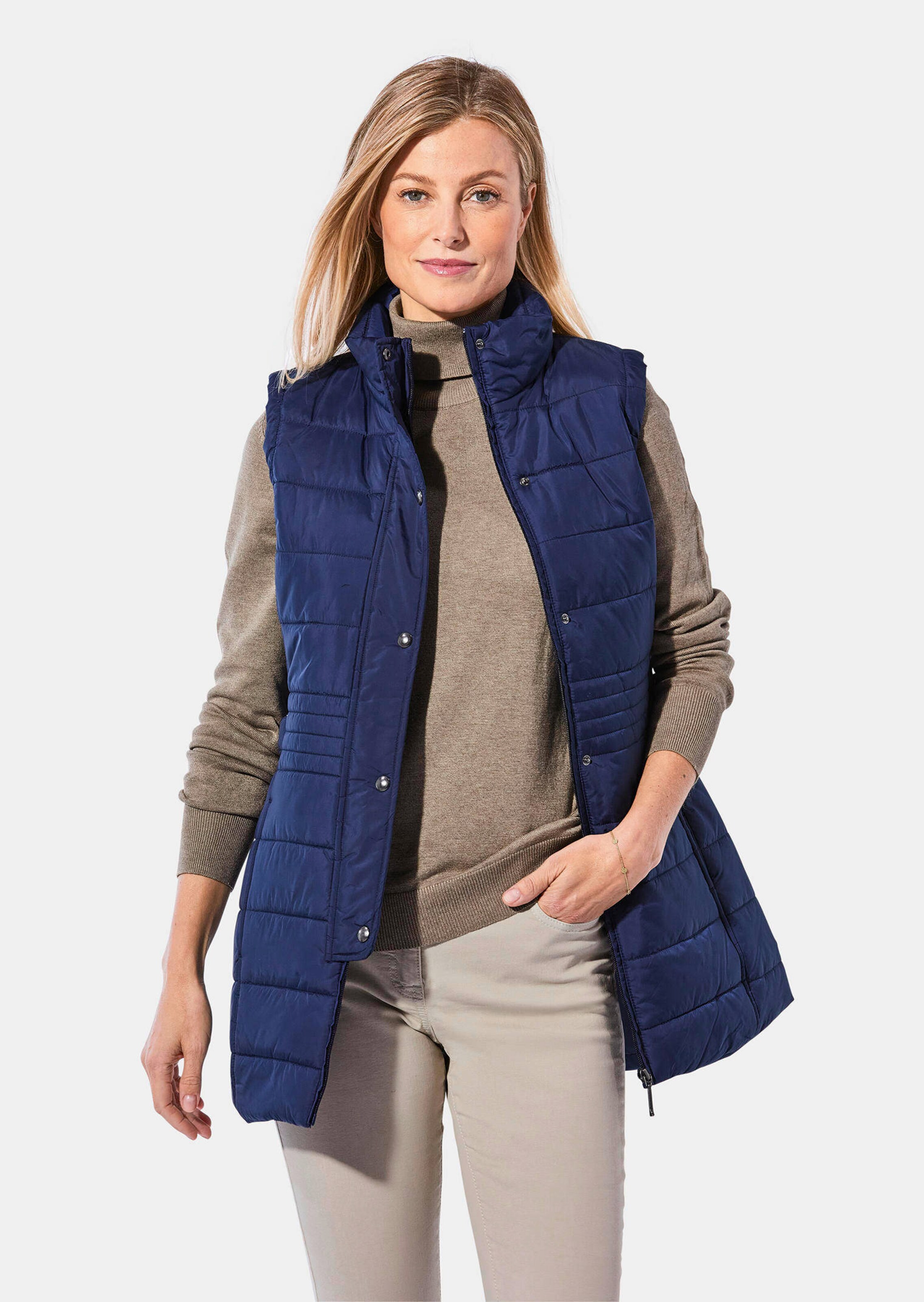 Vest in langer model met aantrekkelijk breedtestiksel. Smallere stiksels in de taille en Weense naden zorgen voor een slankere look. Dankzij een verstelbaar trensje aan beide kanten opzij kunt u dit model extra aansluitend maken. Het vest heeft een ritssluiting die tot in de opstaande kraag loopt. Zo blijft uw hals warm. Een drukknopenlijst beschermt bovendien tegen wind. Met praktische steekzakken opzij. Dit model valt een maat kleiner uit. U kunt dit vest het beste een maat groter bestellen.
