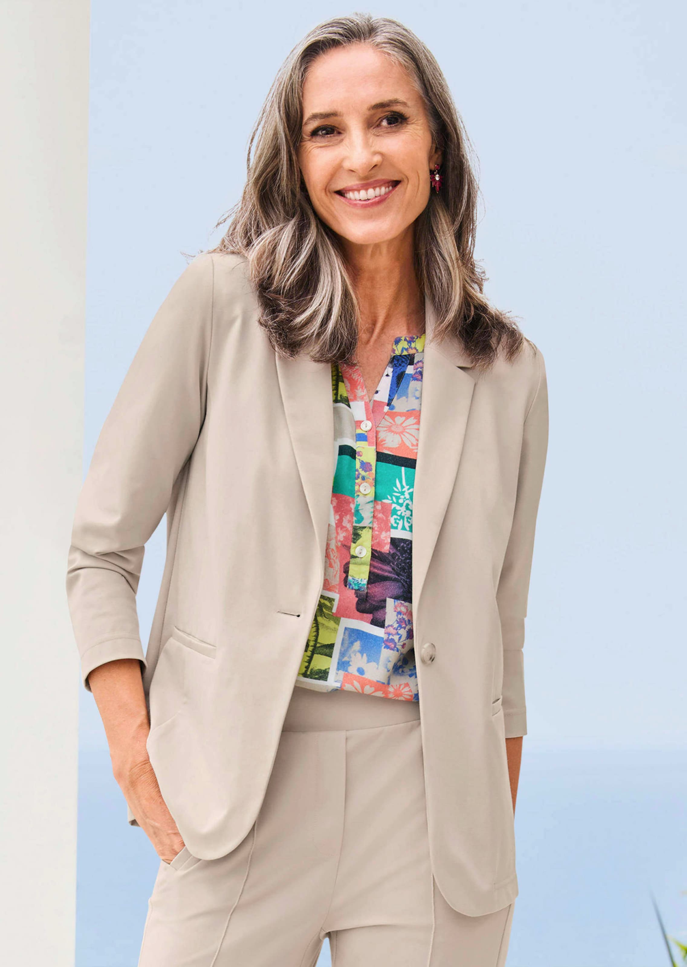 Lichte, ongevoerde blazer van kreukvrij materiaal dat dankzij het hoge aandeel Elastan onbeperkte bewegingsvrijheid biedt. Veelzijdig te combineren en ideaal voor vrijwel elke gelegenheid. De ongecompliceerde allrounder sluit casual met 1 knoop. In de lengte aangebrachte deelnaden zorgen voor een vormgevend silhouet dat u slanker laat lijken. Reverskraag en zakken met paspelering zijn andere mooie details. De hoogwaardige viscosemix biedt veel draagcomfort. Lengte ca. 70 cm in maat 46, ca. 66 cm in maat 23.