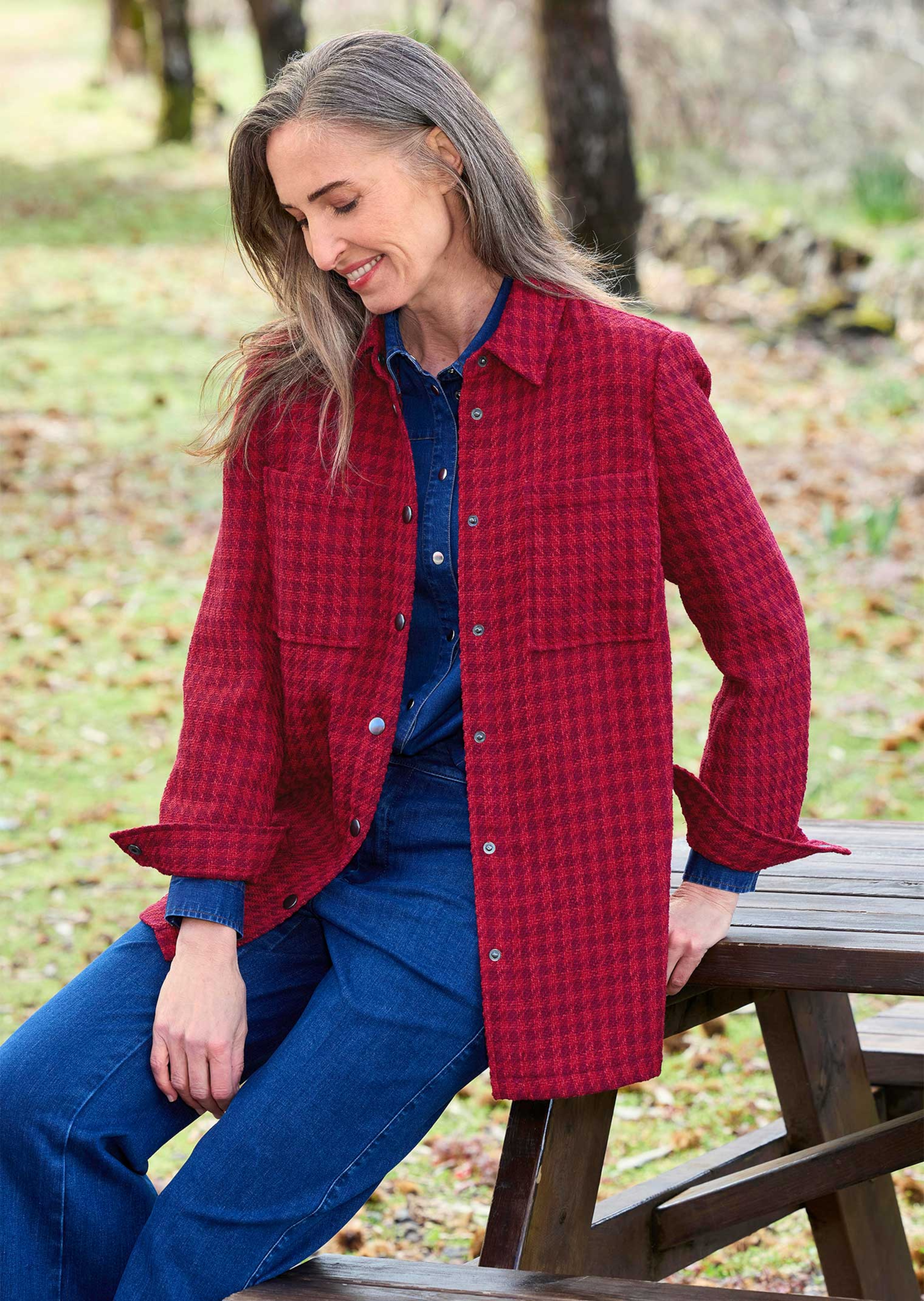 Overhemdjasje van modieus bouclé dat dankzij een stijlvol pepitamotief bijzonder mooi tot uitdrukking komt. Het casual, ongevoerde model is perfect om snel ergens over aan te trekken! Met een overhemdkraag, twee opgestikte borstzakken en metaalkleurige drukknopen als sluiting. Lange mouwen met manchet, split en drukknoop. Lengte ca. 76 cm in maat 46, ca. 72 cm in maat 23.