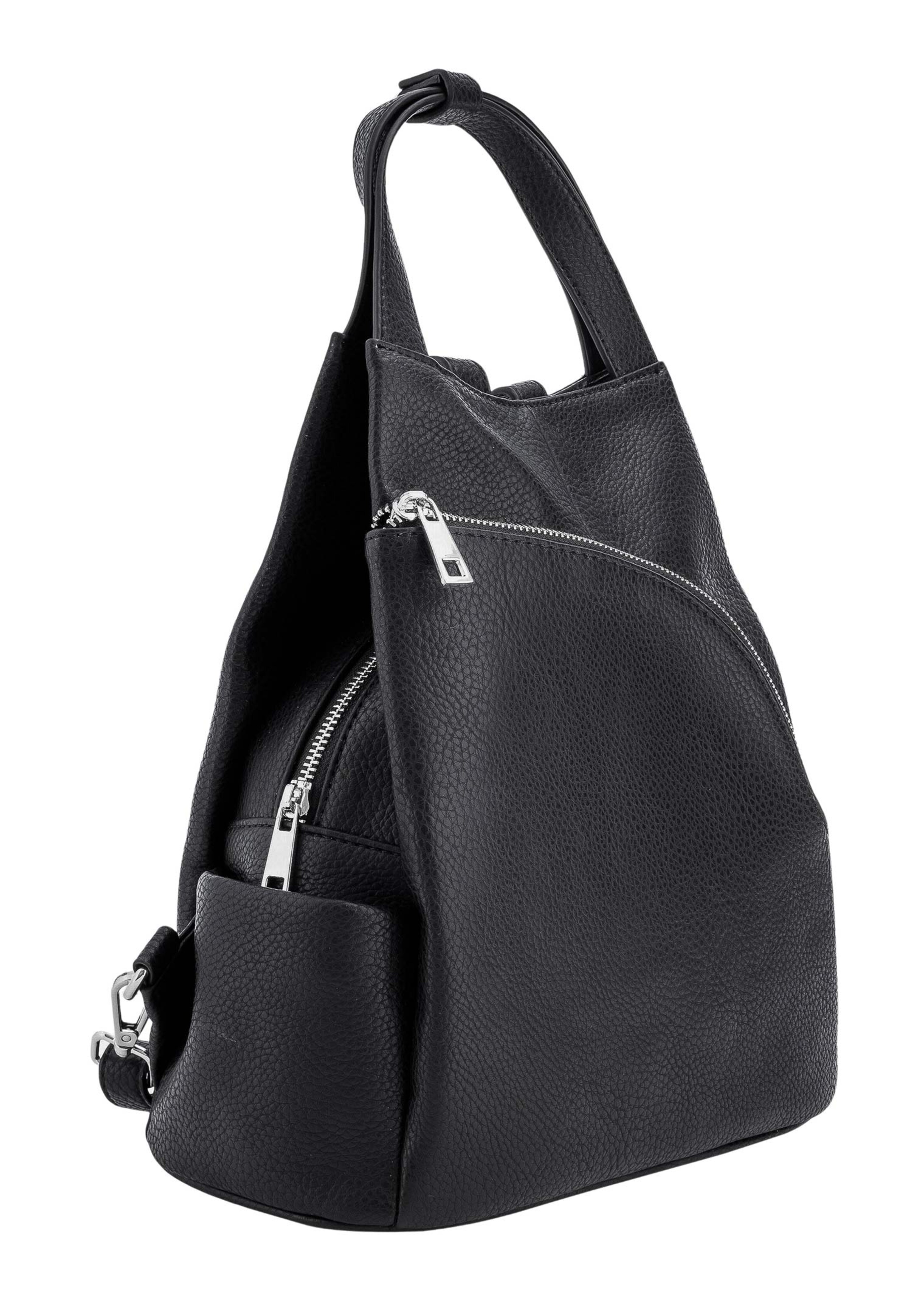 Rugzak met vele praktische vakken met ritssluiting. Hierin kunt u alles veilig kwijt. De chique, generfde structuur voelt bijzonder zacht aan en wekt de indruk van echt leer. De rugzak is comfortabel in de hand te dragen, maar ook op de rug dankzij de smalle, verstelbare banden. Met verborgen vak met ritssluiting achter, een veiligheidsvak aan de binnenkant en een extra vak voor met decoratief schuine ritssluiting. Hoogte x breedte x diepte: 28 x 26 x 13 cm.