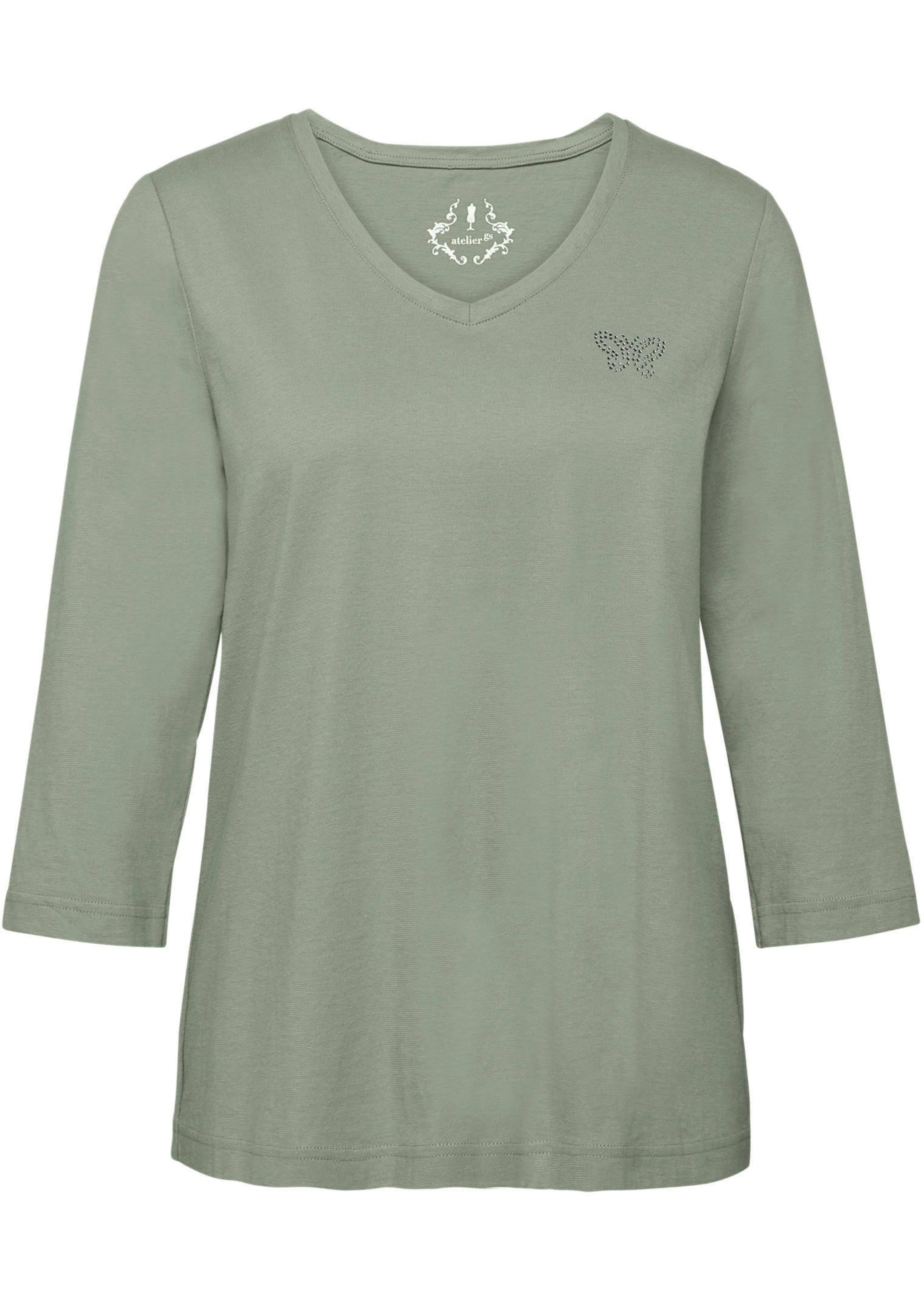 Shirt in grote kleurkeuze en zeer goed te combineren. De fijngeribde jersey van puur katoen biedt een fantastisch draagcomfort. Vrouwelijk detail is de decoratieve vlinder van glittersteentjes. Een mooie basic met V-hals en 3/4-mouwen. Lengte ca. 66 cm in maat 46, ca. 62 cm in maat 23.